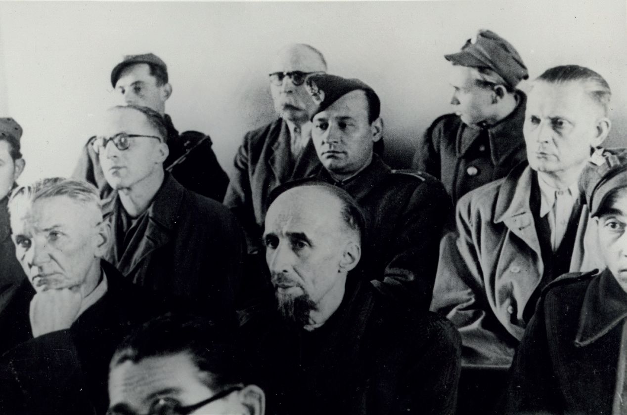 Proces byłych działaczy WRN przed Rejonowym Sądem Wojskowym w Warszawie, maj 1948 r.; na pierwszym planie od lewej: Józef Dzięgielewski (podparty na ręce) i Tadeusz Szturm de Sztrem, w środkowym rzędzie: Wiktor Krawczyk i Ludwik Cohn (na prawo od żołnierza), z tyłu Kazimierz Pużak (między dwoma strażnikami). Fot. AIPN