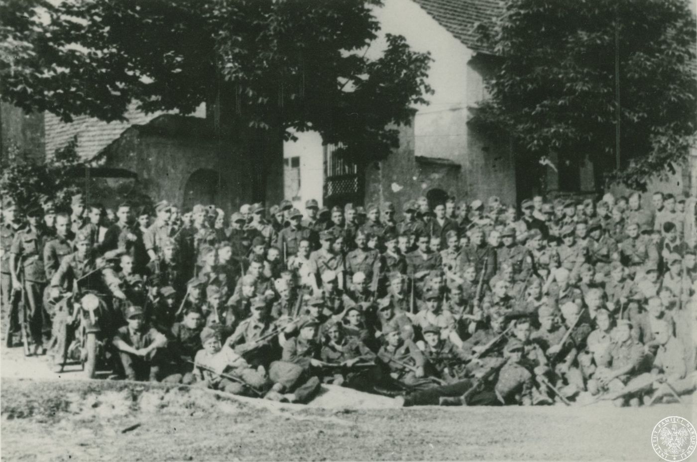 Grupa żołnierzy Brygady Świętokrzyskiej NSZ przed budynkiem w nieznanej miejscowości podczas marszu przez Czechosłowację [?], autor: nieznany, 5 V 1945–30 VI 1945 r. Fot. AIPN