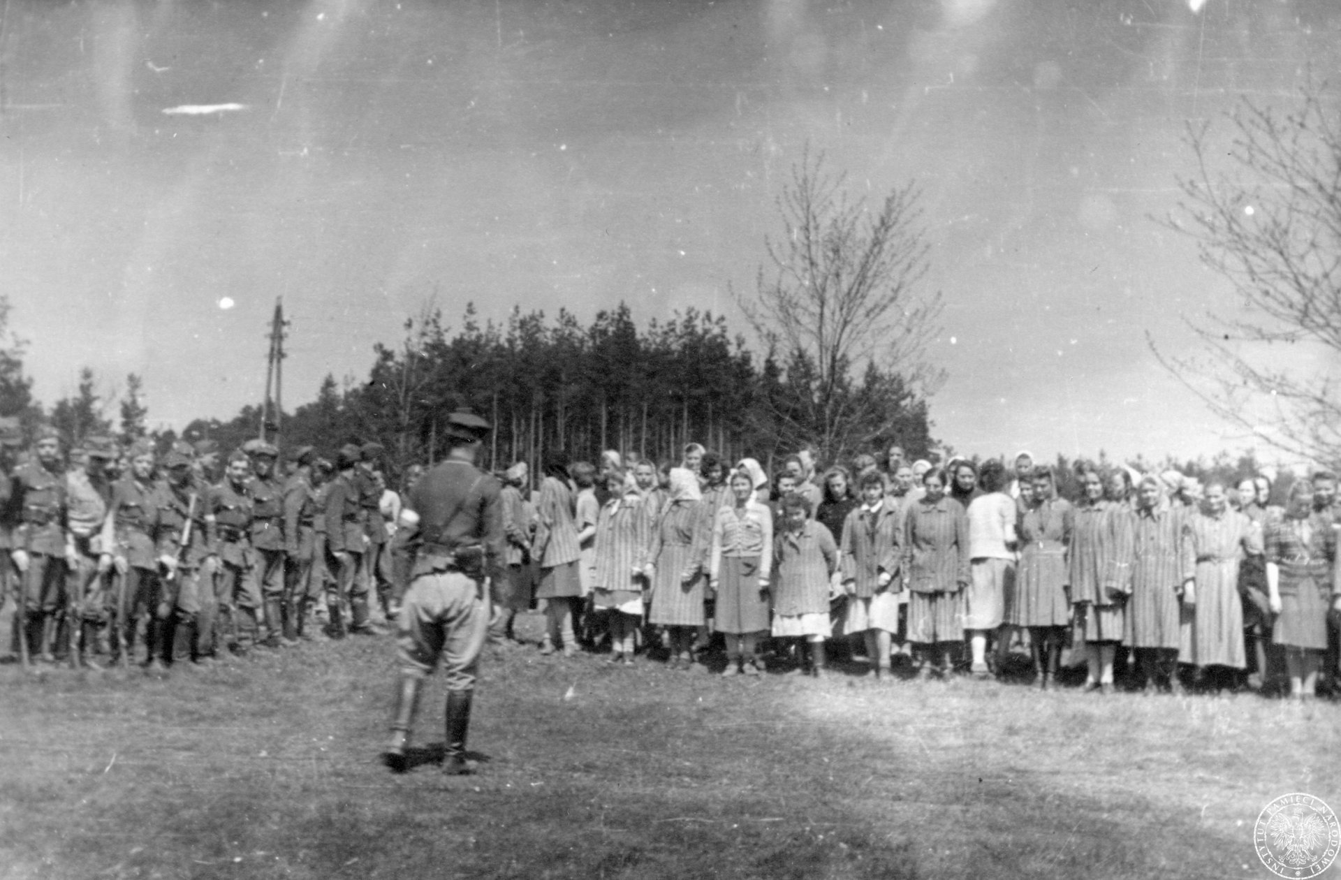 Żołnierze Brygady Świętokrzyskiej NSZ (po lewej) i grupa uwolnionych więźniarek (po prawej) z wyzwolonego 5 maja obozu w Holýšovie (niem. Holleischen) - filii obozu koncentracyjnego KL-Flossenburg w podczas apelu [?], autor: nieznany, 5 V 1945 r. Fot. AIPN
