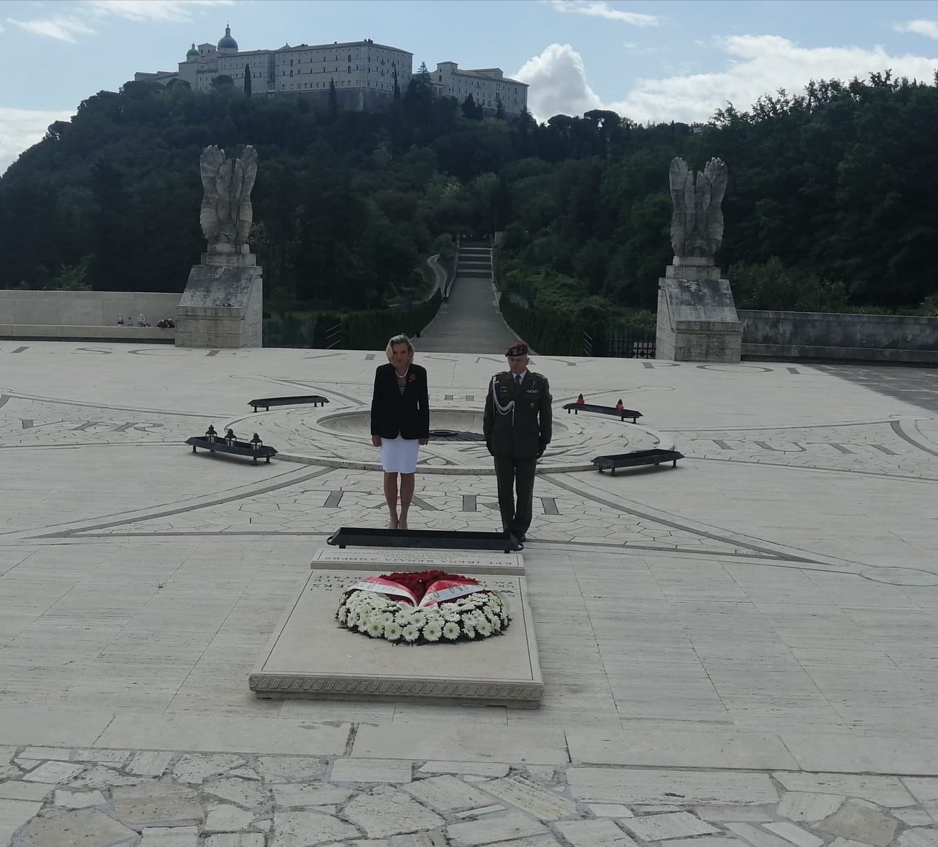 Ambasador Anna Maria Anders i attaché wojskowy płk Jacek Malinowski podczas składania wieńca na grobie gen. Władysława Andersa – Monte Cassino, 12 maja 2020 (źródło: Ambasada RP w Rzymie) -