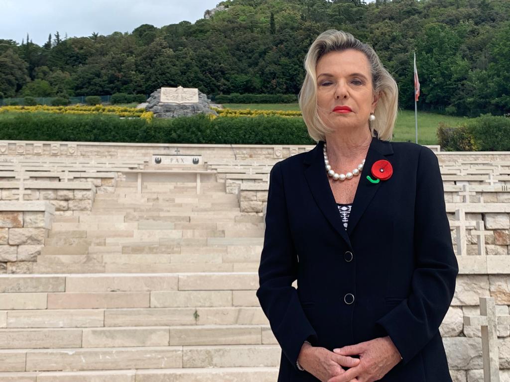 Ambasador Anna Maria Anders podczas składania wieńca na grobie gen. Władysława Andersa – Monte Cassino, 12 maja 2020 (źródło: Ambasada RP w Rzymie) -