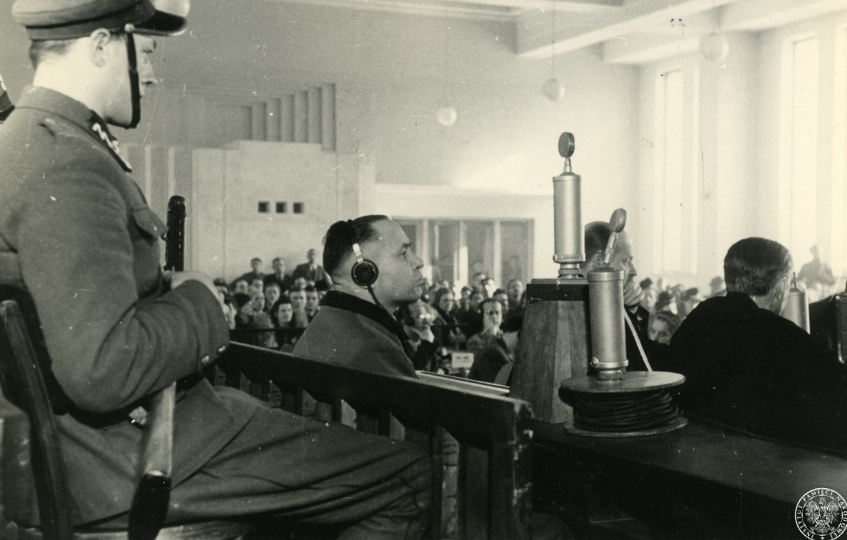 Rudolf Höss (pośrodku, w słuchawkach), były komendant KL Auschwitz-Birkenau, siedzi na ławie oskarżonych w czasie swojego procesu przed Najwyższym Trybunałem Narodowym. Po lewej jeden z siedzących za oskarżonym funkcjonariuszy milicji uzbrojony w tzw. pepeszę. Po prawej w pierwszym rzędzie siedzą m.in. obrońcy z urzędu, marzec 1947 r. Fot. AIPN