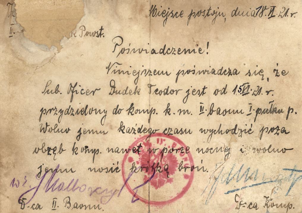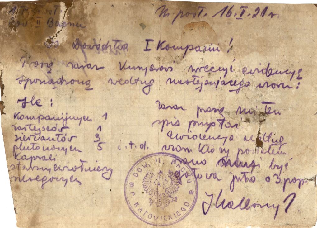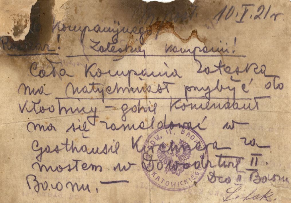 Najciekawsze są oczywiście materiały wytworzone w trakcie powstań i plebiscytu lub ilustrujące z nieco dalszej perspektywy czasowej tamte wydarzenia. W tej grupie prawdziwym skarbem jest spuścizna po Teodorze Dudku, dowódcy Kompanii Załęskiej w III powstaniu śląskim. Jesienią 1920 r. Dudek został najpierw zastępcą dowódcy kompanii, walczył wraz z nią z niemiecką żandarmerią w Wirku, a później został skierowany przez Zabrze i Łabędy w okolice Blachowni Śląskiej oraz Kędzierzyna. 7 maja 1921 r. kompania otrzymała rozkaz zajęcia obu miejscowości i podjęła atak, który jednak został odparty. Gdy podejmowano decyzje co do dalszych działań i liczono straty, okazało się, że oddział został bez dowódcy, który miał się samowolnie oddalić i wrócić do katowickiej dzielnicy Dąb. Wówczas jego miejsce zajął autor wspomnień, pod którego komendą kompania nocą z 7 na 8 maja 1921 r. pomaszerowała na Bierawę, a 8 maja wzięła udział w walkach o Stare Koźle. W kolejnych dniach powstańcy zajęli Kłodnicę i 10 maja dotarli do Odry. Do 16 maja Dudek i jego podkomendni odpoczywali w okolicy Koźla, a potem przez Sławięcice, Zdzieszowice i Rozwadzę wyruszyli w kierunku Gogolina. Tego celu jednak nie osiągnęli – po zaciętej walce we wsi Krępna kompania została wycofana na wschód, w kierunku Lichyni i Zalesia. W Lichyni 31 maja doszło do kolejnego starcia, wygranego przez kompanię Dudka. Cztery dni później powstańcy wrócili do Załęża, gdzie utworzono przy niej pluton ciężkiego karabinu maszynowego. Od 25 czerwca do końca powstania kompania stacjonowała w Bytomiu. W Oddziałowym Archiwum IPN w Katowicach znajduje się rękopis wspomnień jej dowódcy zatytułowany „Spomnienia organizacyjne i walk Kompanii Załęskiej w trzeciem powstaniu śląskiem”, rozkazy z czasu powstania oraz lista z wynikami głosowania plebiscytowego z katowickiej dzielnicy Załęże. Lista jest najprawdopodobniej brudnopisem lub odpisem, nie jest bowiem opatrzona żadnymi pieczęciami czy podpisami. (Zob. ilustracje 1–5)