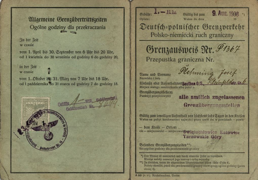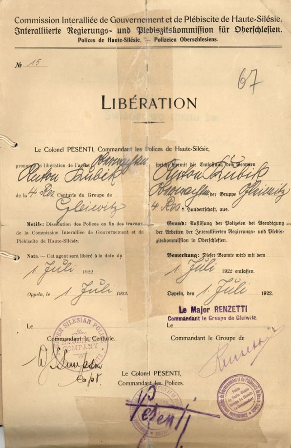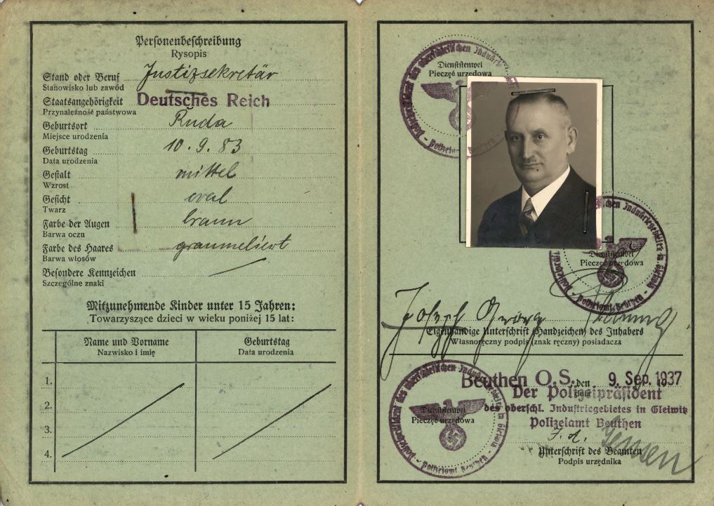 W materiałach operacyjnych SB zachowały się dokumenty wystawione w latach 1921 i 1922 przez Międzysojuszniczą Komisję Rządzącą i Plebiscytową na Górnym Śląsku – międzynarodowy organ powołany na mocy traktatu wersalskiego do przejęcia władzy na terenie plebiscytowym i przygotowania głosowania. Materiały te to paszport, zezwolenie na ponowny wjazd na Górny Śląsk oraz zwolnienie funkcjonariusza policji. Dwa pierwsze dokumenty zostały odnalezione w dość niecodziennych okolicznościach. W 1965 r. nowo mianowany dyrektor Oddziału NBP w Tarnowskich Górach postanowił zrobić porządek z dwoma starymi sejfami zawierającymi skrytki bankowe. Sejfy stały w przejściu i zwyczajnie zawadzały, kluczy nigdzie nie było, a poprzedni dyrektor zapewniał, że skrytki są puste. Wobec tego nowe kierownictwo postanowiło rozwiercić wiertarką zamki patentowe i zdemontowany sprzęt wywieźć na złom. Okazało się jednak, że bank włamuje się do depozytów, ponieważ w kilku skrytkach znajdowały się skrzynki wypełnione dokumentami lub/i biżuterią oraz pieniędzmi. Natychmiast powołano komisję, która uczestniczyła w dalszym otwieraniu sejfów i sporządziła spis ich zawartości. Wtedy właśnie w skrzynce nr 41 odnaleziono opisane tu dokumenty. Ich dysponent poza nimi złożył w sejfie swoje świadectwa, książeczki oszczędnościowe a nawet zaświadczenie o współpracy w latach 1928–1932 z niemiecką policją kryminalną, która z kolei pozyskane od niego informacje przekazywała do Abwehry do Wrocławia. Właściciel depozytu w okresie międzywojennym mieszkał w różnych miejscach w Niemczech, a podczas II wojny światowej osiedlił się w Nakle Śląskim w powiecie tarnogórskim i zapewne wtedy złożył w skrytce bankowej niebezpieczne pod koniec wojny papiery. Kolejne lata nie sprzyjały upominaniu się o pozostawione w Tarnowskich Górach materiały, a gdy go namierzono (kilka lat po otwarciu skrytki) mieszkał w RFN i nic nie wskazywało na to, aby chciał się pojawić w swoim rodzinnym mieście. (Zob. ilustracje 6–8)