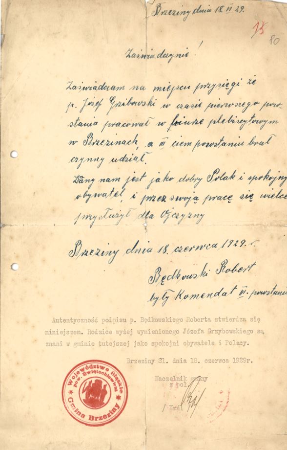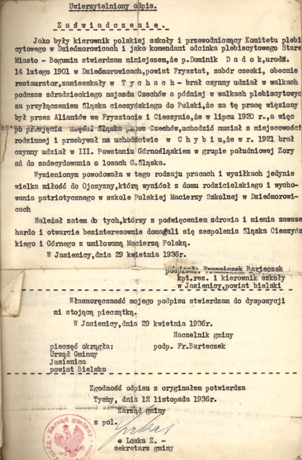 Z lat 1929 i 1936 pochodzą zaświadczenia wystawione dla uczestników III powstania śląskiego. Jeden z nich już przed przyłączeniem się do powstańców zdobył doświadczenie bojowe, walcząc podczas „zdradzieckiego najazdu Czechów” w czasie polsko-czechosłowackiego konfliktu zbrojnego w 1919 r., w trakcie którego Czesi opanowali Zaolzie. (Zob. ilustracje 10–11)