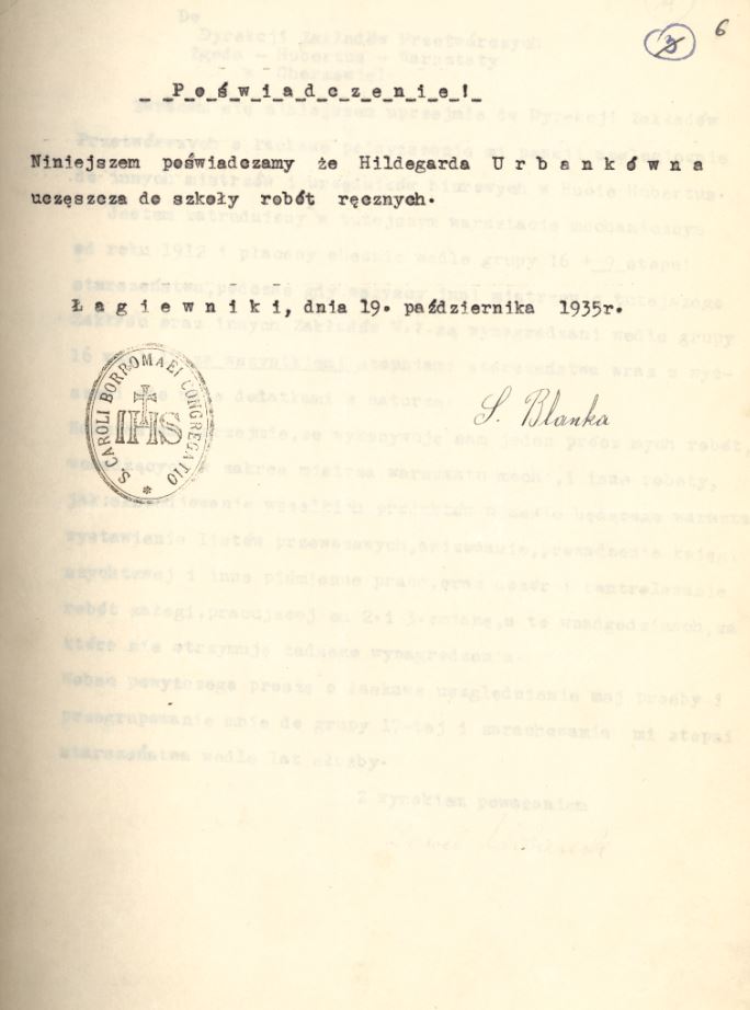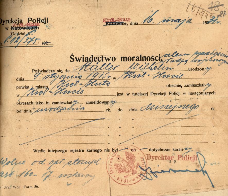 W zapomniany już świat dwudziestolecia międzywojennego przenoszą nas dokumenty, których wystawienia raczej próżno było by oczekiwać dziś od instytucji czy urzędów: poświadczenie o pobieraniu nauki w klasztornej szkole robót ręcznych, świadectwo moralności sygnowane przez dyrektora Policji z Królewskiej Huty czy metryka zatytułowana „Zaświadczenie o zarejestrowaniu wypadku urodzin”. Wszystkie one trafiły do IPN właściwie trochę przypadkowo: po II wojnie światowej dołączano je do różnych spraw jako dowody na propolską postawę we wcześniejszym okresie wymienionych w nich osób. (Zob. ilustracje 18–20)