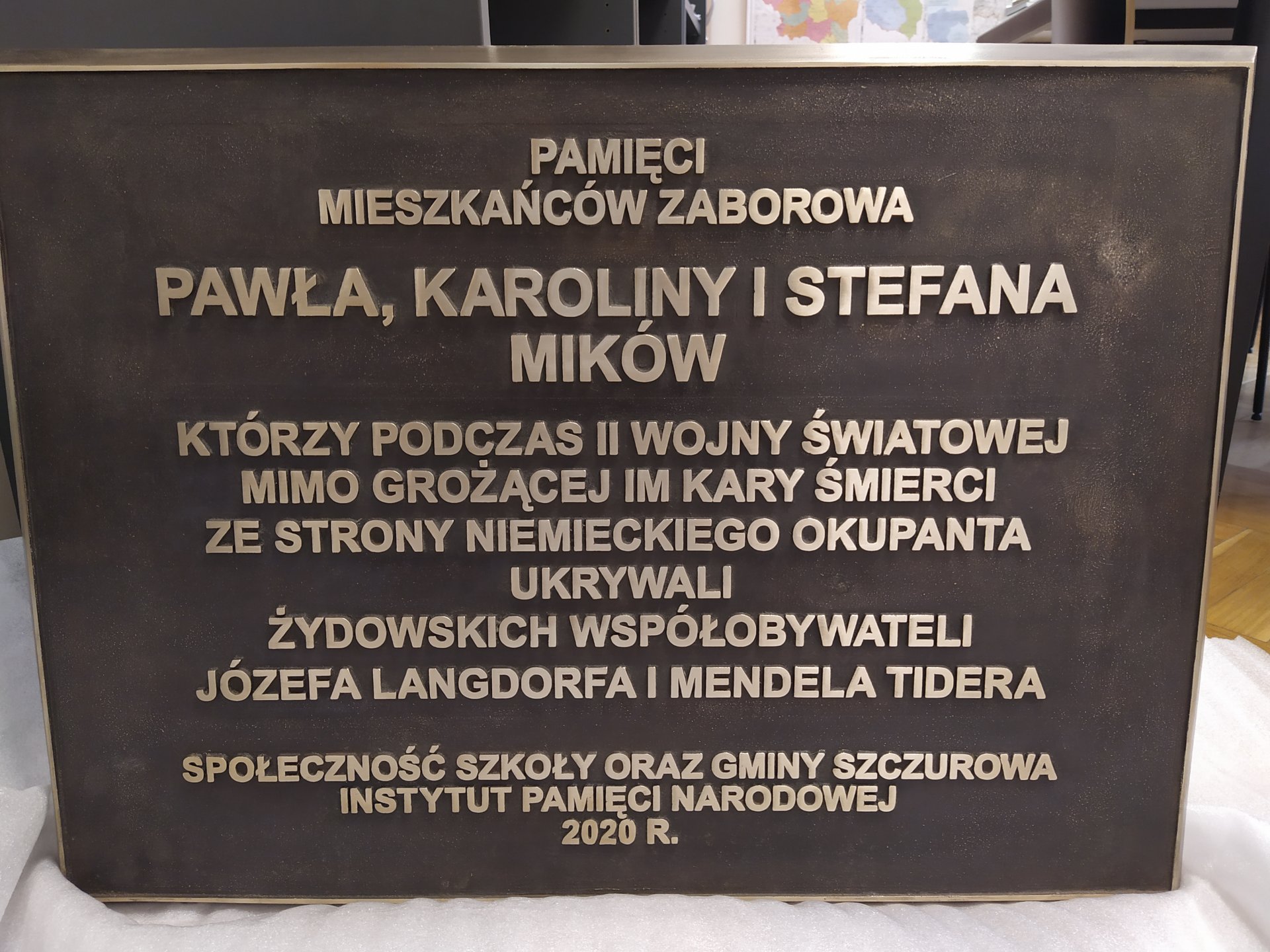 Tablica na budynku Publicznej Szkoły Podstawowej im. Władysława Jagiełły upamiętniająca Karolinę, Pawła i Stefana Mików udzielających schronienia Żydom: Józefowi Langdorfowi oraz Mendelowi Tiderowi.
