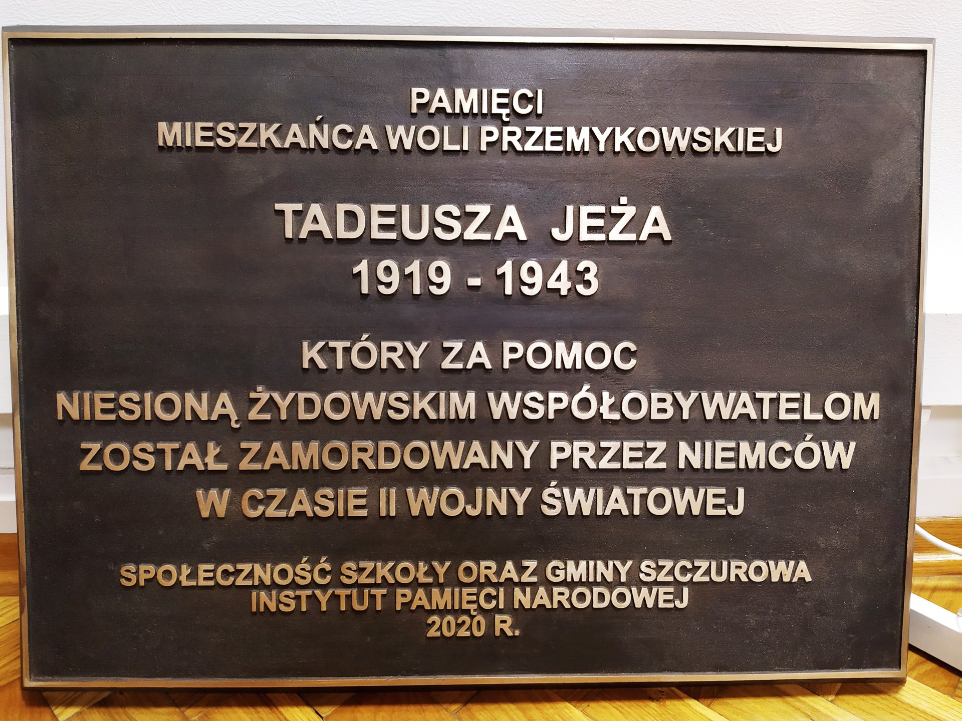 Tablica na budynku Publicznej Szkoły Podstawowej im. Władysława Jagiełły upamiętniająca Tadeusza Jeża, który za ukrywanie Żydów został zamordowany przez Niemców w 1943 r.