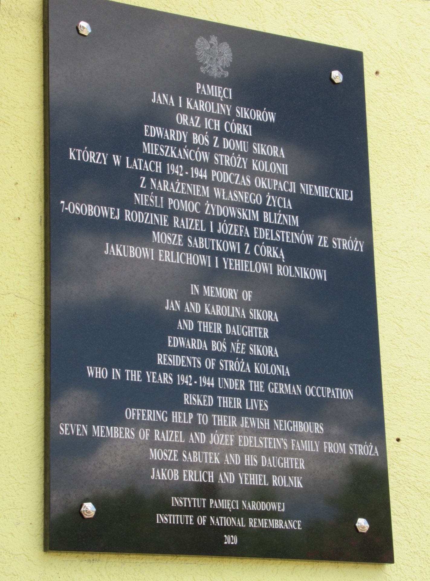 Tablica upamiętniająca rodzinę Sikorów ze Stróży Kolonii, którzy przez przeszło dwa lata udzielali w swym gospodarstwie schronienia żydowskim współobywatelom, m.in. 7-osobowej rodzinie Edelsteinów, przed wojną mieszkającej w Stróży, która dzięki nim w całości przetrwała niemiecką okupację. Poza rodziną Edelsteinów z pomocy Sikorów korzystały cztery kolejne osoby zbiegłe z kraśnickiego getta, z których trzy przeżyły wojnę. W 1994 r. Edwarda Boś z domu Sikora i jej zmarli rodzice Karolina i Jan zostali uhonorowani tytułem „Sprawiedliwych wśród Narodów Świata”.