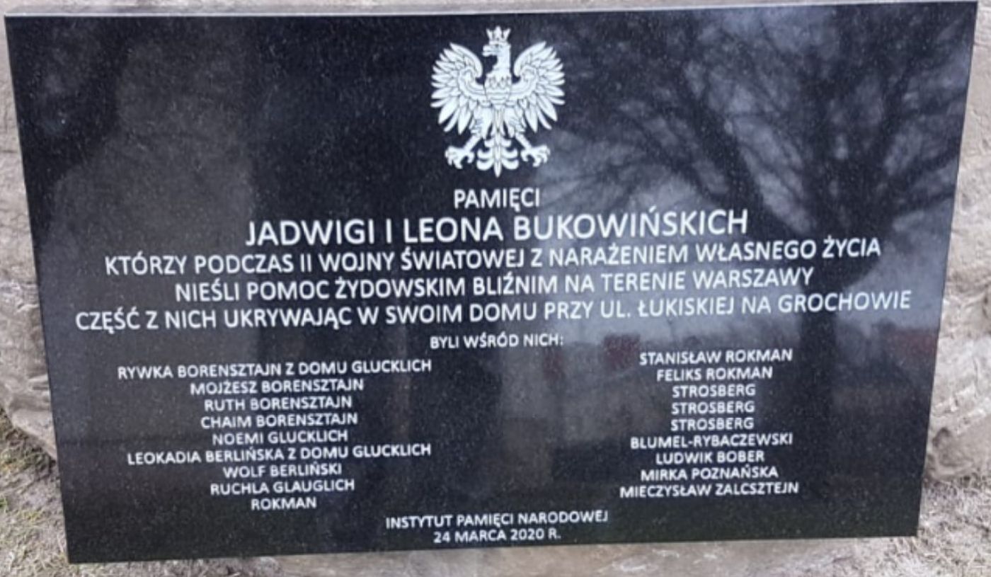 Tablica upamiętniająca Jadwigę i Leona Bukowińskich, umieszczona na głazie przy kościele pw. Najczystszego Serca Maryi w Warszawie (ul. Chłopickiego 2).