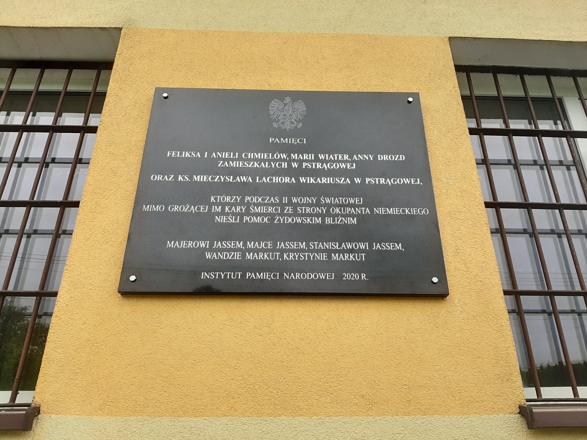 Tablica upamiętniająca Feliksa i Anielę Chmielów, Marię Wiater, Annę Drozd, zamieszkałych w Pstrągowej oraz ks. Mieczysława Lachora, wikariusza w Pstrągowej, którzy podczas II wojny światowej mimo grożącej im kary śmierci ze strony okupanta niemieckiego nieśli pomoc żydowskim bliźnim: Majerowi, Stanisławowi i Majce Jassom oraz Wandzie i Krystynie Markut.
