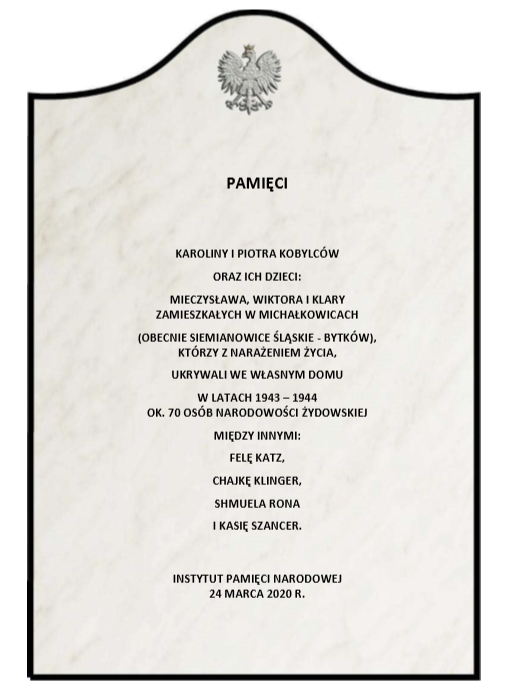 Tablica upamiętniająca rodzinę Kobylców z Michałkowic (obecnie Siemianowic Śląskich-Bytkowa), która od jesieni 1943 r. do stycznia 1944 r. z narażeniem życia ukrywała w swoim domu ok. 70 osób narodowości żydowskiej. Tablica w Zespole Szkół Sportowych w Siemianowicach Śląskich (w budynku Szkoły Podstawowej nr 8 przy Placu Skrzeka i Wójcika 4) została odsłonięta 20 marca 2020.