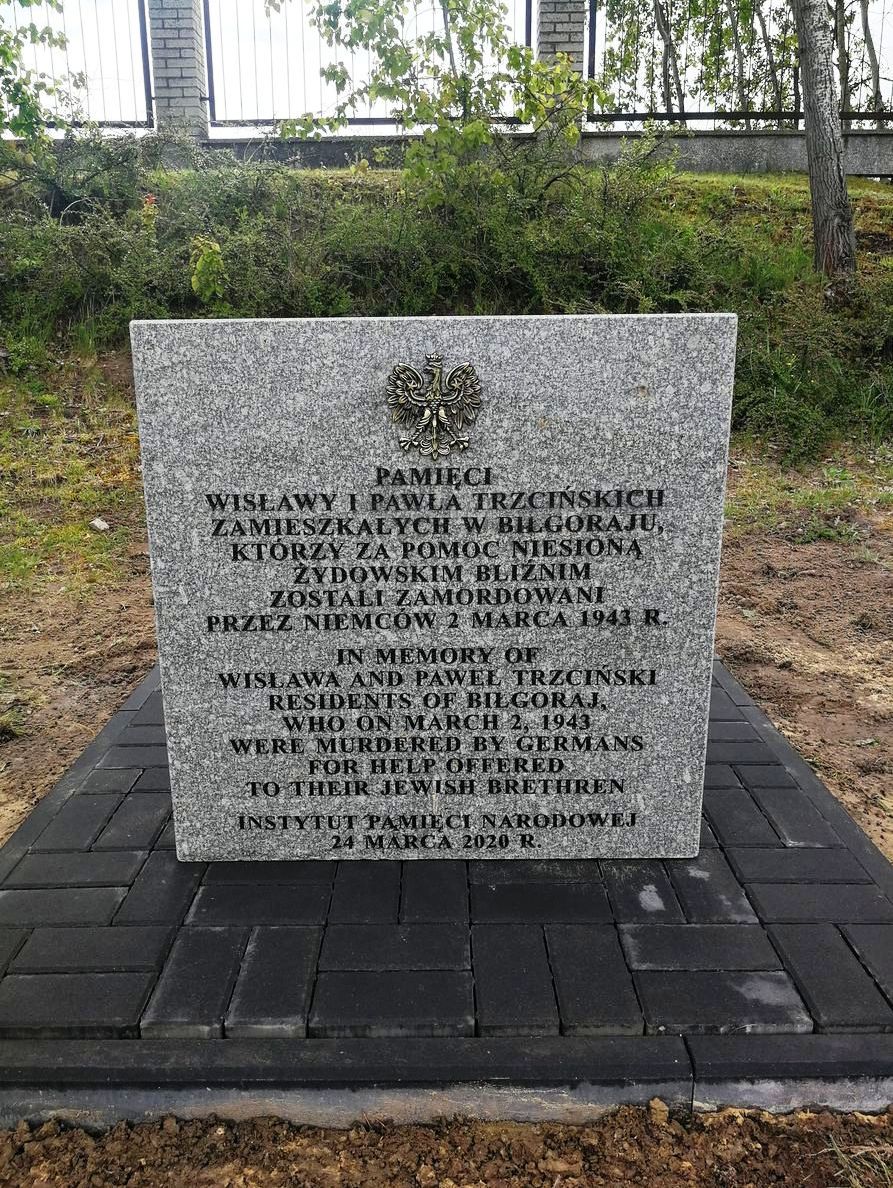 Tablica upamiętniająca Wiesławę i Pawła Trzcińskich z Biłgoraja zamordowanych przez Niemców za pomoc Żydom. W czasie okupacji niemieckiej na terenie skupu skór, prowadzonego przez Pawła Trzcińskiego, ukrywały się przynajmniej dwie rodziny żydowskie. W lutym 1943 r. Niemcy aresztowali Trzcińskich, a ukrywanych Żydów rozstrzelali na miejscu. Po brutalnym śledztwie Niemcy rozstrzelali także Wiesławę i Pawła. Ocalała jedynie ich córka, Gabriela, która w momencie aresztowania była poza budynkiem.