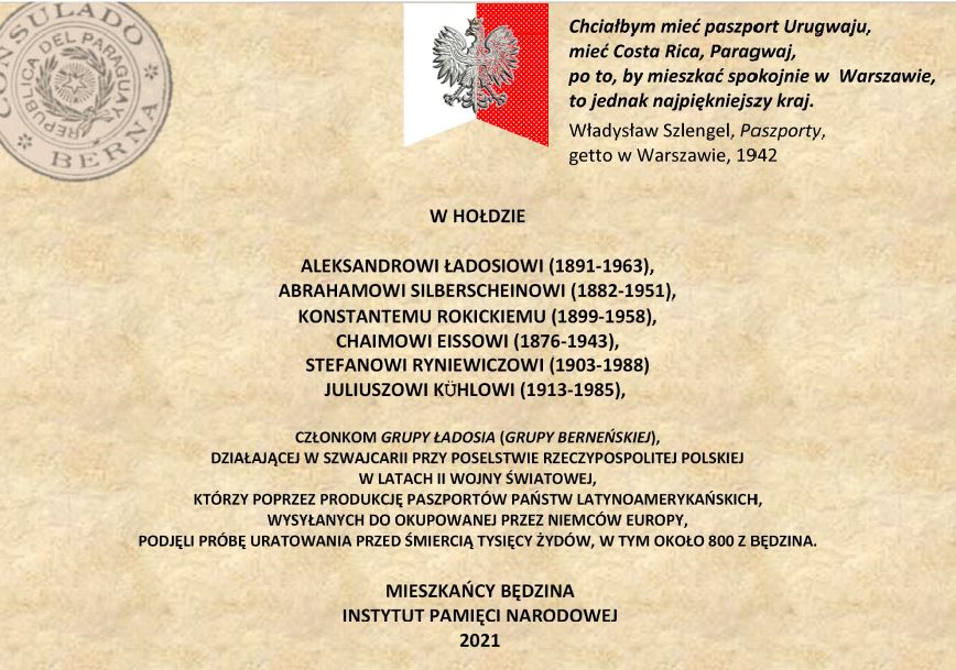 Tablica poświecona tzw. Grupie Ładosia, czyli grupie polskich dyplomatów i działaczy żydowskich, którzy w latach 1941–1943 zajmowała się podrabianiem i szmuglowaniem ze Szwajcarii do Polski i innych krajów Europy paszportów krajów Ameryki Łacińskiej dla ratowania Żydów europejskich. Warto podkreślić, iż w kręgu uratowanych osób pochodzenia żydowskiego znajdowali się zwłaszcza przedwojenni obywatele polscy, niemieccy i holenderscy. W kręgu tych pierwszych wielu pochodziło z Zagłębia Dąbrowskiego, tj. z Sosnowca, Dąbrowy Górniczej i Będzina. Na obecnym etapie badań ustalono, że 796 mieszkańców Będzina zostało uratowanych przez Grupę Ładosia.