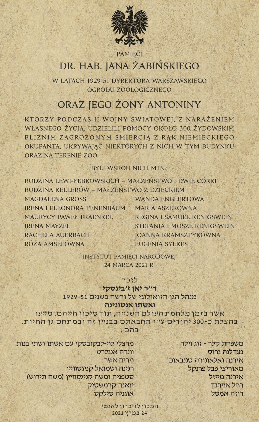 Tablica upamiętniająca Jana i Antoninę Żabińskich, wybitnych polskich przyrodników, Sprawiedliwych wśród Narodów Świata.