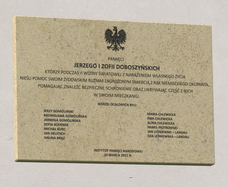 Tablica upamietniająca Jerzego i Zofię Doboszyńskich, którzy udzielili schronienia lub pomogli znaleźć bezpieczną kryjówkę żydowskim współobywatelom: Janowi i Edzie Leśniewskim-Landau, Alinie, Ewie i Marii Chlewickim, Jerzemu, Bronisławie i Jadwidze Gomólińskim, Zofii Koerner, Michałowi Kurcowi, Janowi Deutsch, Halinie Brąz i Pawłowi Piotrowskiemu.