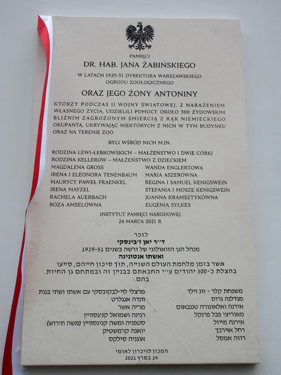 Tablicę upamiętniającą Jana i Antoninę Żabińskich, wybitnych polskich przyrodników, uhonorowanych tytułem Sprawiedliwy wśród Narodów Świata, przygotował warszawski oddział IPN w związku z obchodami Narodowego Dnia Pamięci Polaków ratujących Żydów pod okupacją niemiecką .