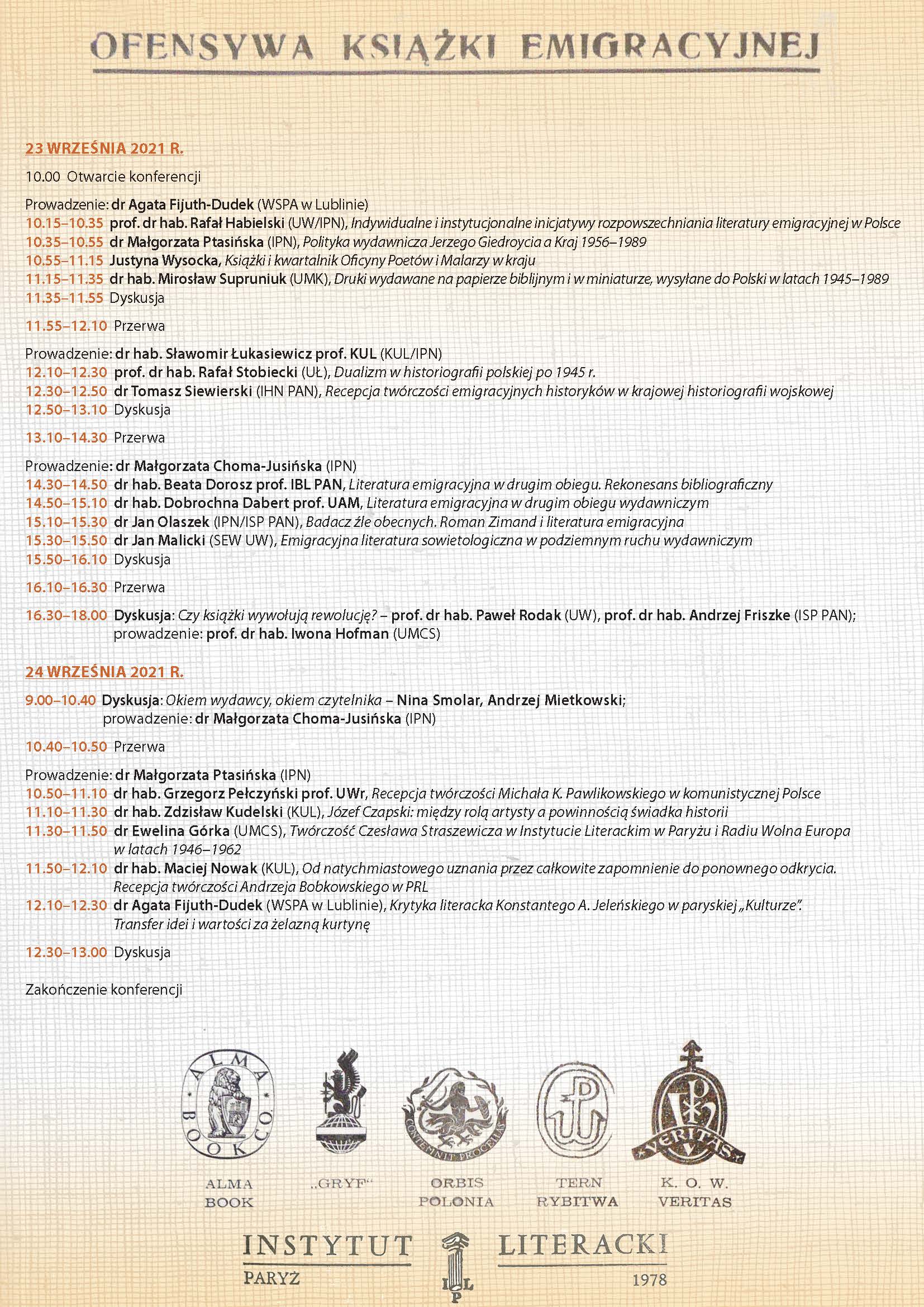 • 14.50–15.10 dr hab. Dobrochna Dabert prof. UAM, Literatura emigracyjna w drugim obiegu wydawniczym