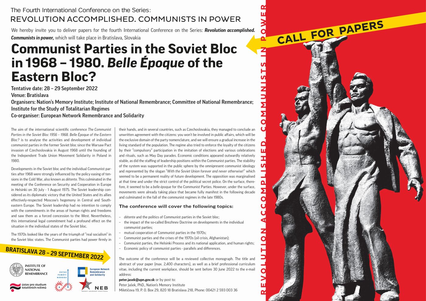 The aim of the international scientific conference The Communist Parties in the Soviet Bloc 1968 – 1980. Belle Époque of the Eastern Bloc? is to analyse the activities and development of individual communist parties in the former Soviet bloc since the Warsaw Pact invasion of Czechoslovakia in Augusta 1968 until the founding of the Independent Trade Union Movement Solidarity in Poland in 1980.