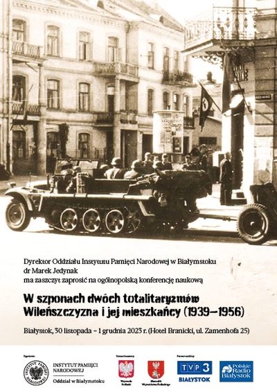 W czasie jubileuszu 700-lecia istnienia miasta Wilno białostocki oddział Instytutu Pamięci Narodowej organizuje ogólnopolską konferencję naukową pt. „W szponach dwóch totalitaryzmów – Wileńszczyzna i jej mieszkańcy (1939–1956)” w Białymstoku (Hotel Branicki, ul. Zamenhofa 25). W wydarzeniu wezmą udział badacze dziejów Wileńszczyzny zarówno z Polski, jak i z zagranicy. Konferencja odbędzie się w dniach 30 listopada – 1 grudnia 2023.