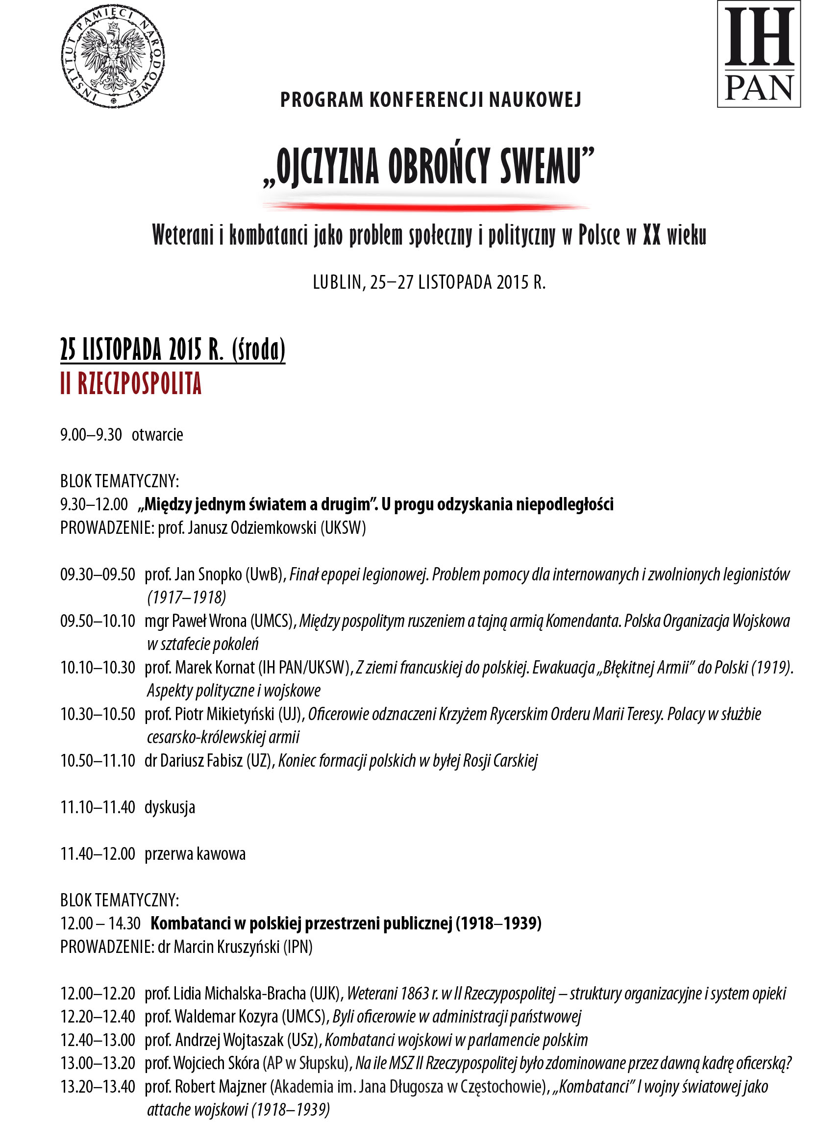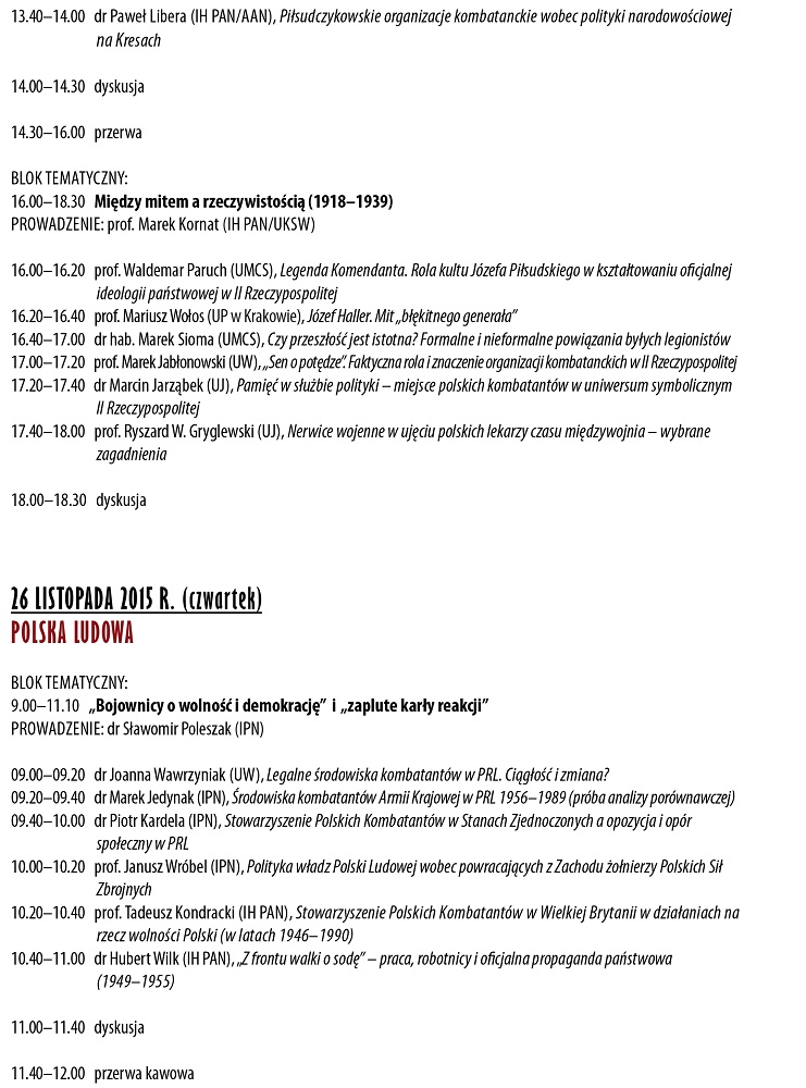 - 13.40–14.00 dr Paweł Libera (IH PAN/AAN), Piłsudczykowskie organizacje kombatanckie wobec polityki narodowościowej na Kresach