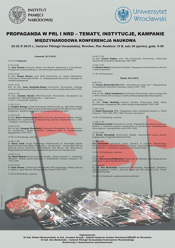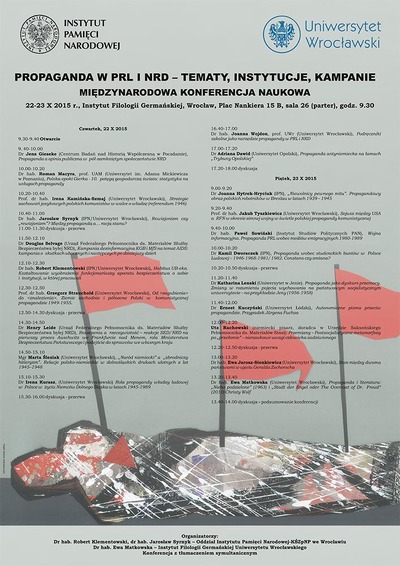 W dniach 22–23 października br. w Instytucie Filologii Germańskiej (pl. Nankiera 15 B) odbędzie się międzynarodowa konferencja naukowa „Propaganda w PRL i NRD – tematy, instytucje, kampanie”. Jej organizatorami są: Oddział Instytutu Pamięci Narodowej we Wrocławiu oraz Instytut Filologii Germańskiej Uniwersytetu Wrocławskiego.