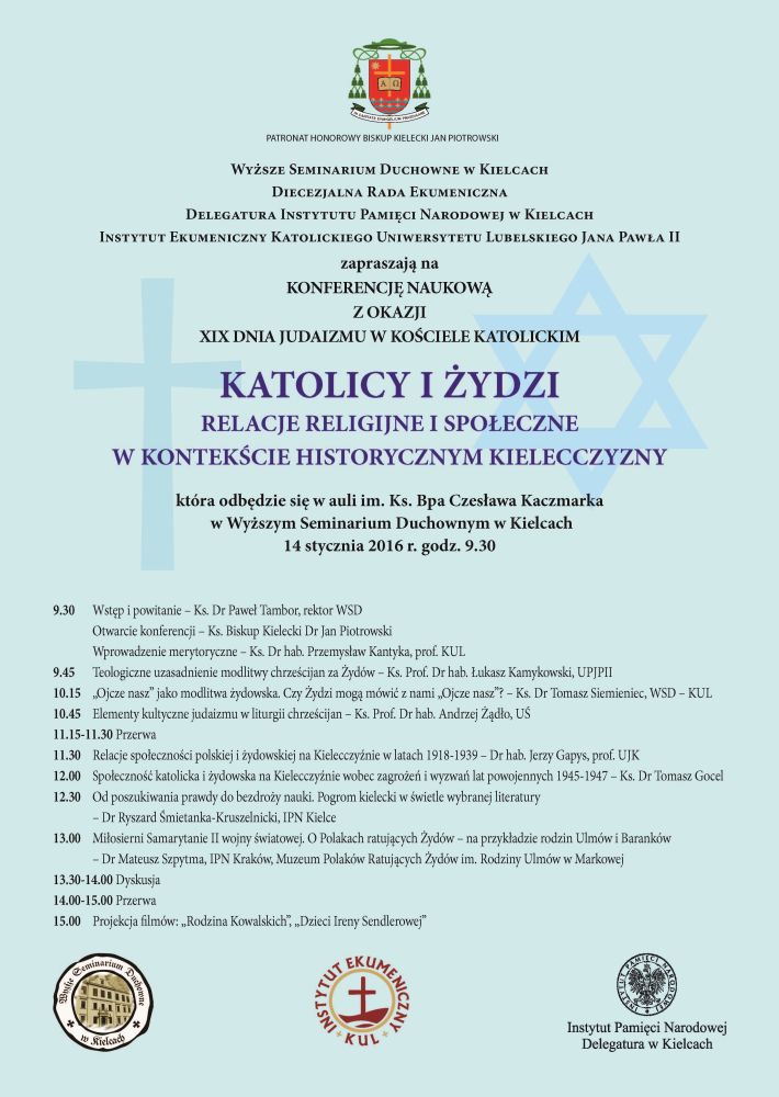 14 stycznia 2016 r., o godz. 9.30, w Wyższym Seminarium Duchownym (aula im. ks. bp. Czesława Kaczmarka) w Kielcach, przy ul. Jana Pawła II 7, odbędzie się konferencja naukowa „Katolicy i Żydzi. Relacje religijne i społeczne w kontekście historycznym Kielecczyzny”.