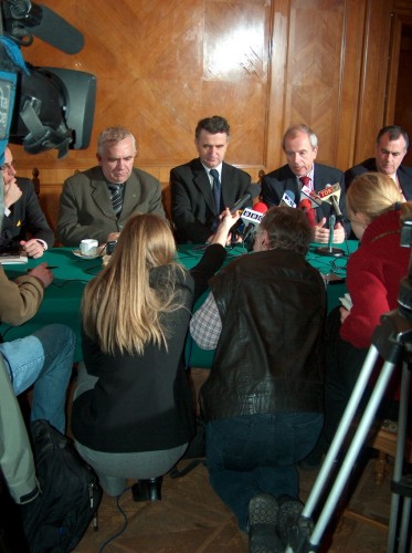 4 – Konferencja prasowa: od lewej dr hab. Paweł Machcewicz, poseł Józef Gruszka, prof. dr hab. Leon Kieres, prof. dr hab. Klaus Ziemer, Ambasador Izraela w Polsce David Peleg
