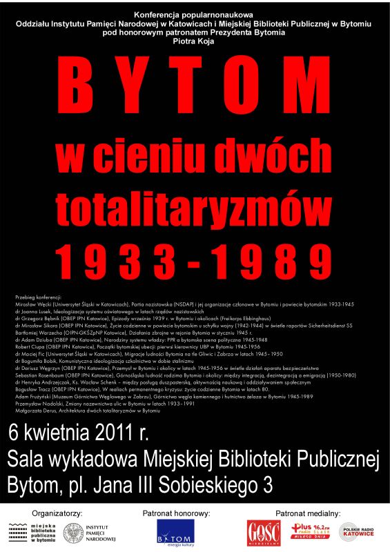 Oddział Instytutu Pamięci Narodowej w Katowicach wraz z Miejską Biblioteką Publiczną w Bytomiu zorganizował konferencję popularnonaukową „Bytom w cieniu dwóch totalitaryzmów: 1933–1989”, która odbyła się 6 kwietnia 2011 r. w siedzibie Miejskiej Biblioteki Publicznej w Bytomiu (pl. Jana III Sobieskiego 3). Konferencja odbyła się pod patronatem honorowym Piotra Koja – Prezydenta Bytomia. Patronat medialny: „Gość Niedzielny”, Radio Plus, Polskie Radio Katowice. Konferencji towarzyszyła prezentacja wystaw katowickiego IPN: „Górnośląski Azyl” oraz „Oczy i uszy bezpieki. Metody inwigilacji społeczeństwa przez Służbę Bezpieczeństwa za pomocą środków technicznych: tajnej obserwacji, dokumentacji fotograficznej perlustracji korespondencji i podsłuchów w latach 1956–1989”.