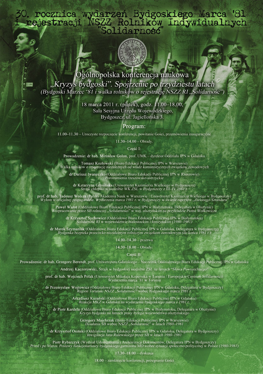 Jednym z głównych elementów obchodów trzydziestej rocznicy Bydgoskiego Marca ’81 w Bydgoszczy była ogólnopolska konferencja naukowa pt. „»Kryzys bydgoski«. Spojrzenie po trzydziestu latach (Bydgoski Marzec i walka rolników o rejestrację NSZZ RI »Solidarność«)”. Jej organizatorem był pion edukacyjno-naukowy bydgoskiej delegatury IPN.