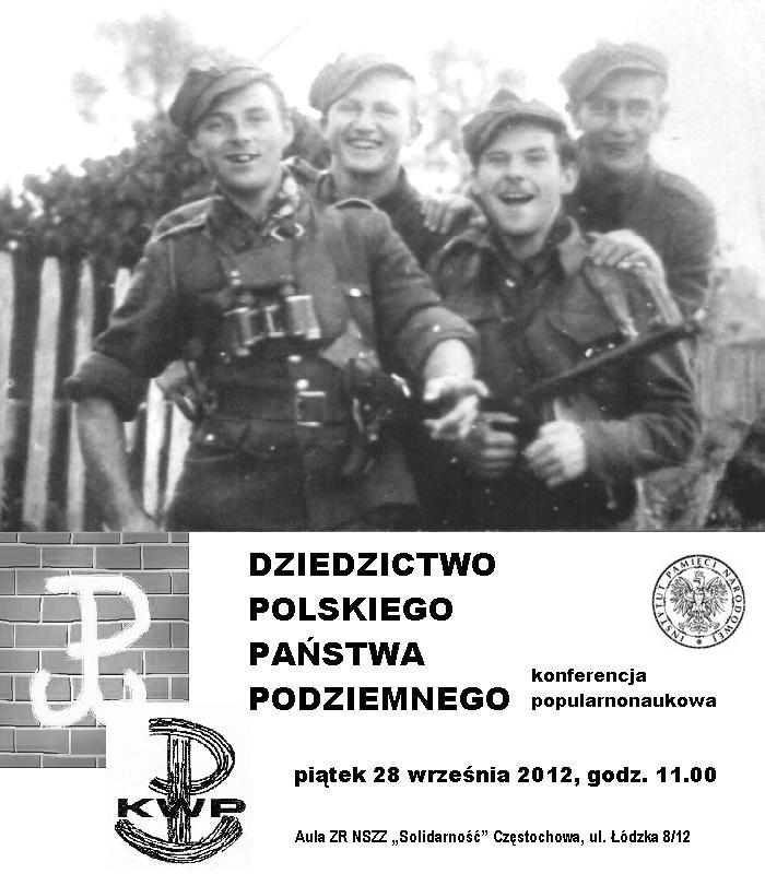 28 września 2012 w auli Zarządu Regionu Częstochowskiego NSZZ „Solidarność” w Częstochowie (ul. Łódzka 8/12) odbyła się konferencja popularnonaukowa „Dziedzictwo Polskiego Państwa Podziemnego”. Organizatorem wydarzenia był Oddział Instytutu Pamięci Narodowej w Katowicach przy współpracy Zarządu Regionu Częstochowskiego NSZZ „Solidarność”.