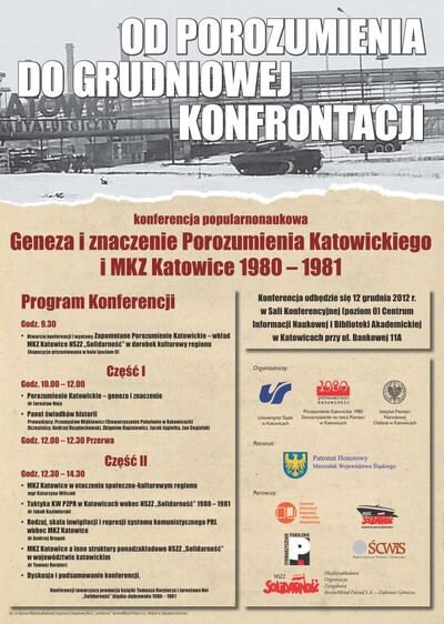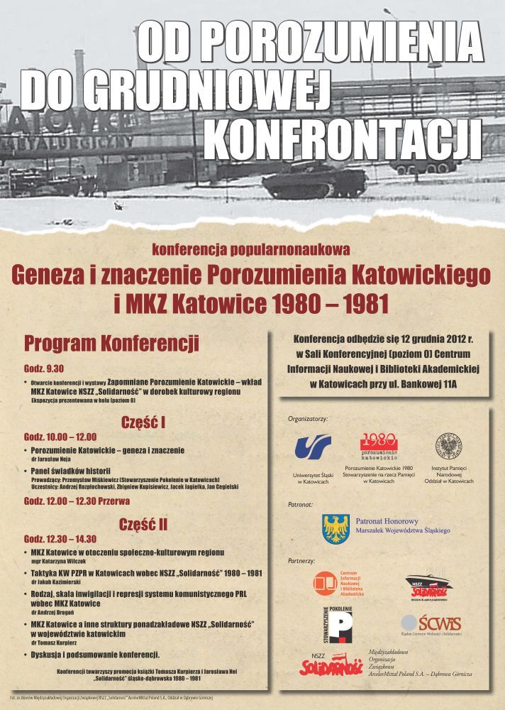 Uniwersytet Śląski w Katowicach, Porozumienie Katowickie 1980 – Stowarzyszenie na rzecz Pamięci w Katowicach oraz Oddział Instytutu Pamięci Narodowej w Katowicach zorganizowały konferencję popularnonaukową „Od porozumienia do grudniowej konfrontacji. Geneza i znaczenie Porozumienia Katowickiego i MKZ Katowice 1980–1981”, która odbyła się 12 grudnia 2012 r. w Sali Konferencyjnej (poziom 0) Centrum Informacji Naukowej i Biblioteki Akademickiej w Katowicach przy ul. Bankowej 11A.