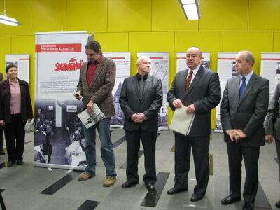 Otwarcie wystawy „Zapomniane Porozumienie Katowickie…” – od prawej: prof. dr hab. Andrzej Kowalczyk, dr Andrzej Drogoń, Andrzej Rozpłochowski, Przemysław Miśkiewicz, Ewa Żurawska -