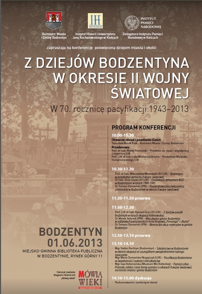 1 czerwca 2013 r. w Bodzentynie odbędzie się konferencja poświęcona dziejom miasta i okolic „Z dziejów Bodzentyna w okresie II wojny światowej. W 70. rocznicę pacyfikacji 1943–2013”, zorganizowana przez Urząd Miasta i Gminy w Bodzentynie, Instytut Historii Uniwersytetu Jana Kochanowskiego w Kielcach i Delegaturę IPN w Kielcach. Patronat medialny nad konferencją objął Magazyn Historyczny „Mówią wieki”.