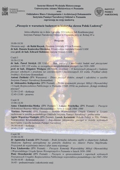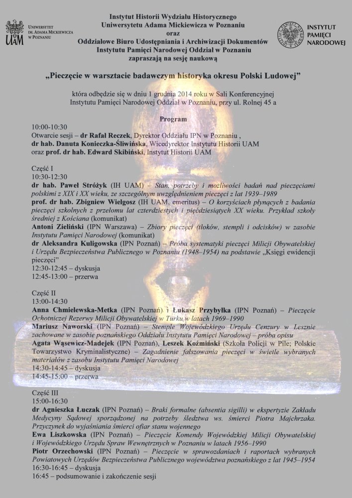 1 grudnia 2014 r. w sali konferencyjnej IPN w Poznaniu odbyła się sesja naukowa „Pieczęcie w warsztacie badawczym historyka okresu Polski Ludowej".