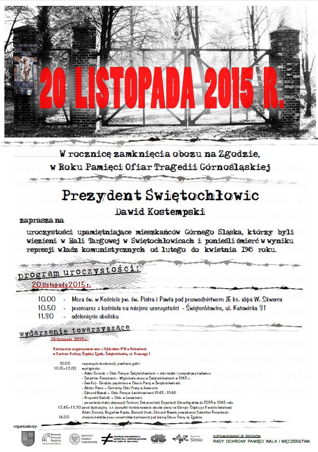 19 listopada 2015 r. w Centrum Kultury Śląskiej Zgoda w Świętochłowicach, przy ul. Krauzego 1, odbędzie się konferencja naukowa zorganizowana w ramach obchodów Roku Pamięci Ofiar Tragedii Górnośląskiej. Wydarzenie zostało zorganizowana we współpracy z katowickim oddziałem IPN.