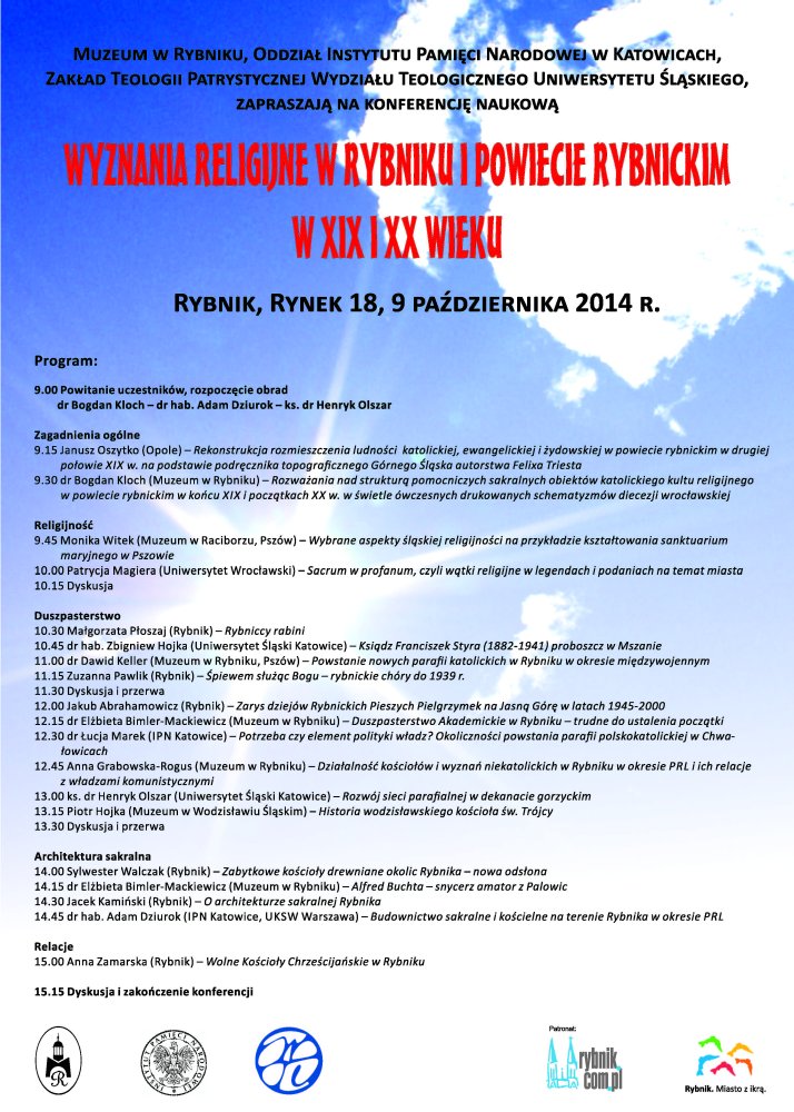 9 października 2014 r. w Rybniku (Rynek 18) odbędzie się konferencja naukowa „Wyznania religijne w Rybniku i powiecie rybnickim w XIX i XX wieku". Organizatorzy: Muzeum w Rybniku, Oddział Instytutu Pamięci Narodowej w Katowicach oraz Zakład Teologii Patrystycznej Wydziału Teologicznego Uniwersytetu Śląskiego.