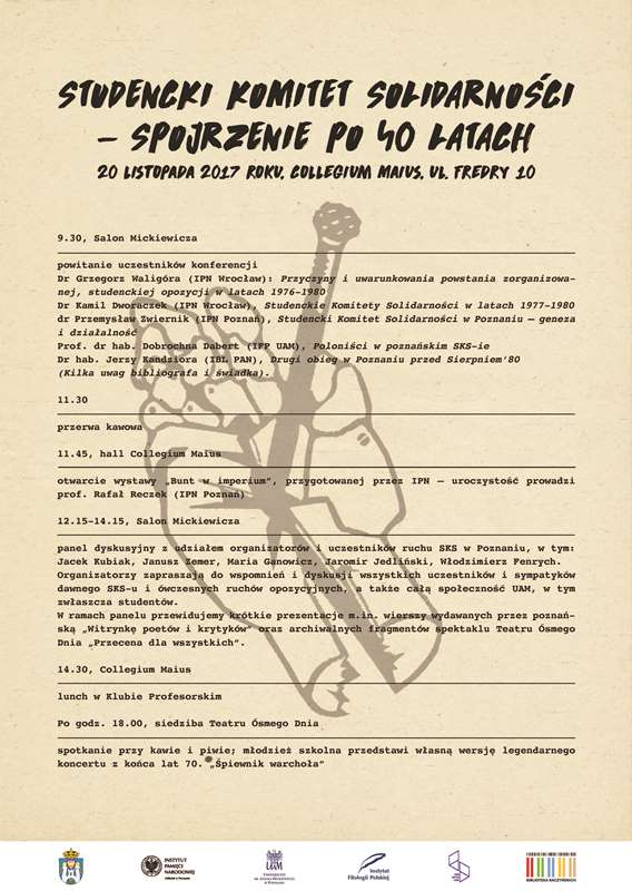 20 listopada 2017 roku w Collegium Maius Uniwersytetu im. Adama Mickiewicza w Poznaniu odbyła się uroczysta sesja naukowa „Studencki Komitet Solidarności – spojrzenie po 40 latach” zorganizowana przez Oddziałowe Biuro Badań Historycznych IPN w Poznaniu i Instytut Filologii Polskiej UAM w Poznaniu. W pierwszej części spotkania, mającej formę konferencji naukowej, wystąpiło czterech prelegentów. Dr Grzegorz Waligóra (IPN Wrocław) przybliżył przyczyny i uwarunkowania powstania zorganizowanej, studenckiej opozycji w latach 1976–1980, dr Przemysław Zwiernik (IPN Poznań) opisał genezę i działalność Studenckiego Komitetu Solidarności w Poznaniu, następnie prof. Dobrochna Dabert (IFP UAM) przypomniała udział polonistów w poznańskim SKS-ie, a dr hab. Jerzy Kandziora omówił drugi obieg wydawniczy w Poznaniu przed Sierpniem `80.