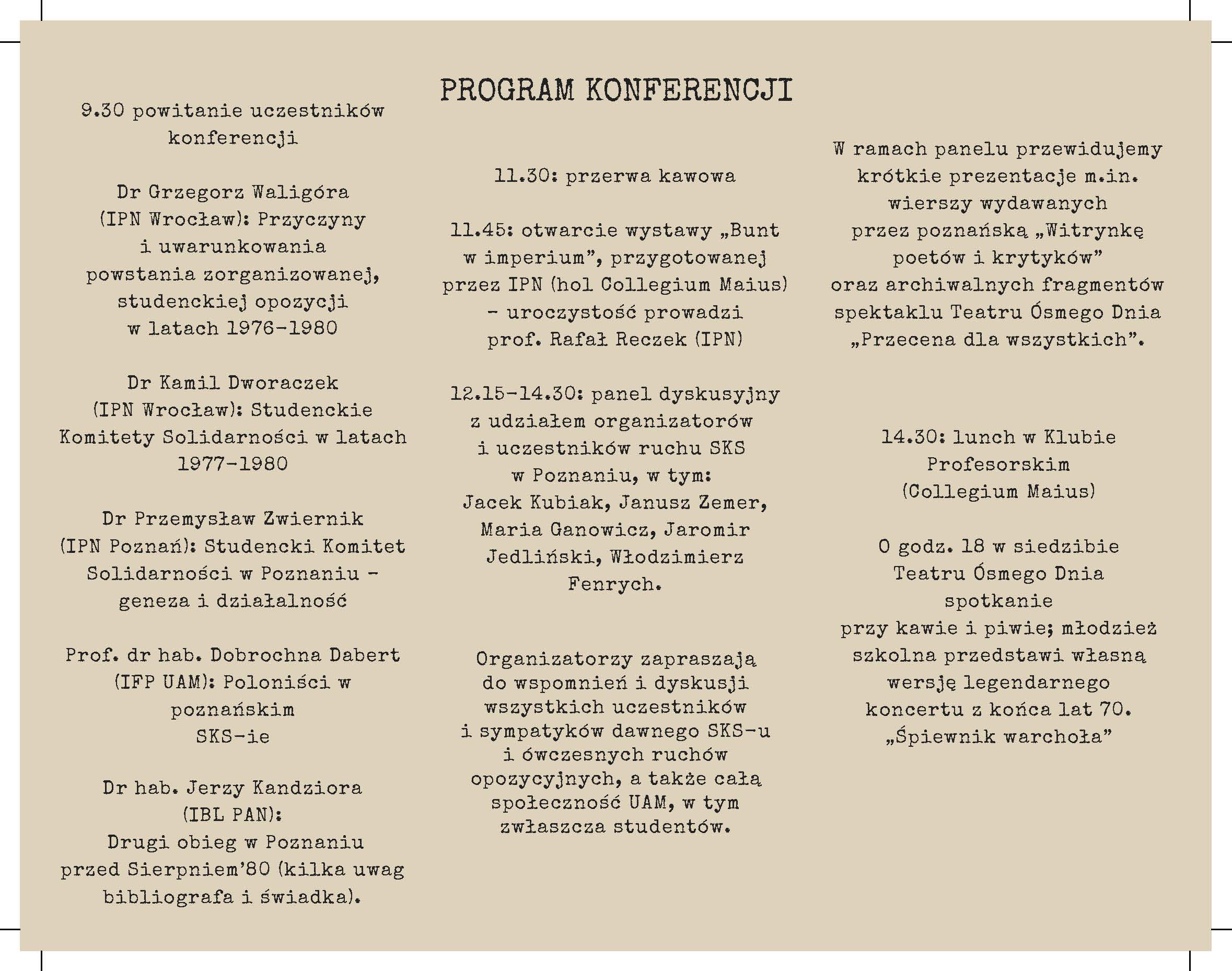 Po krótkiej przerwie, w trakcie której dyrektor poznańskiego oddziału IPN, dr hab. Rafał Reczek, otworzył przygotowaną przez Instytut wystawę „Bunt w imperium”, rozpoczęła się druga część spotkania, mająca formę panelu dyskusyjnego, moderowanego przez prof. Jerzego Fiećko, z udziałem organizatorów i uczestników SKS w Poznaniu, w tym: Jacka Kubiaka, Janusza Zemera, Marii Ganowicz, Jaromira Jedlińskiego i Włodzimierza Fenrycha. W ramach panelu zaprezentowano także kilka wierszy (deklamowanych przez studentów polonistyki UAM) wydanych przez poznańską „Witrynkę literatów i krytyków” oraz archiwalny fragment spektaklu „Przecena dla wszystkich” Teatru Ósmego Dnia.
