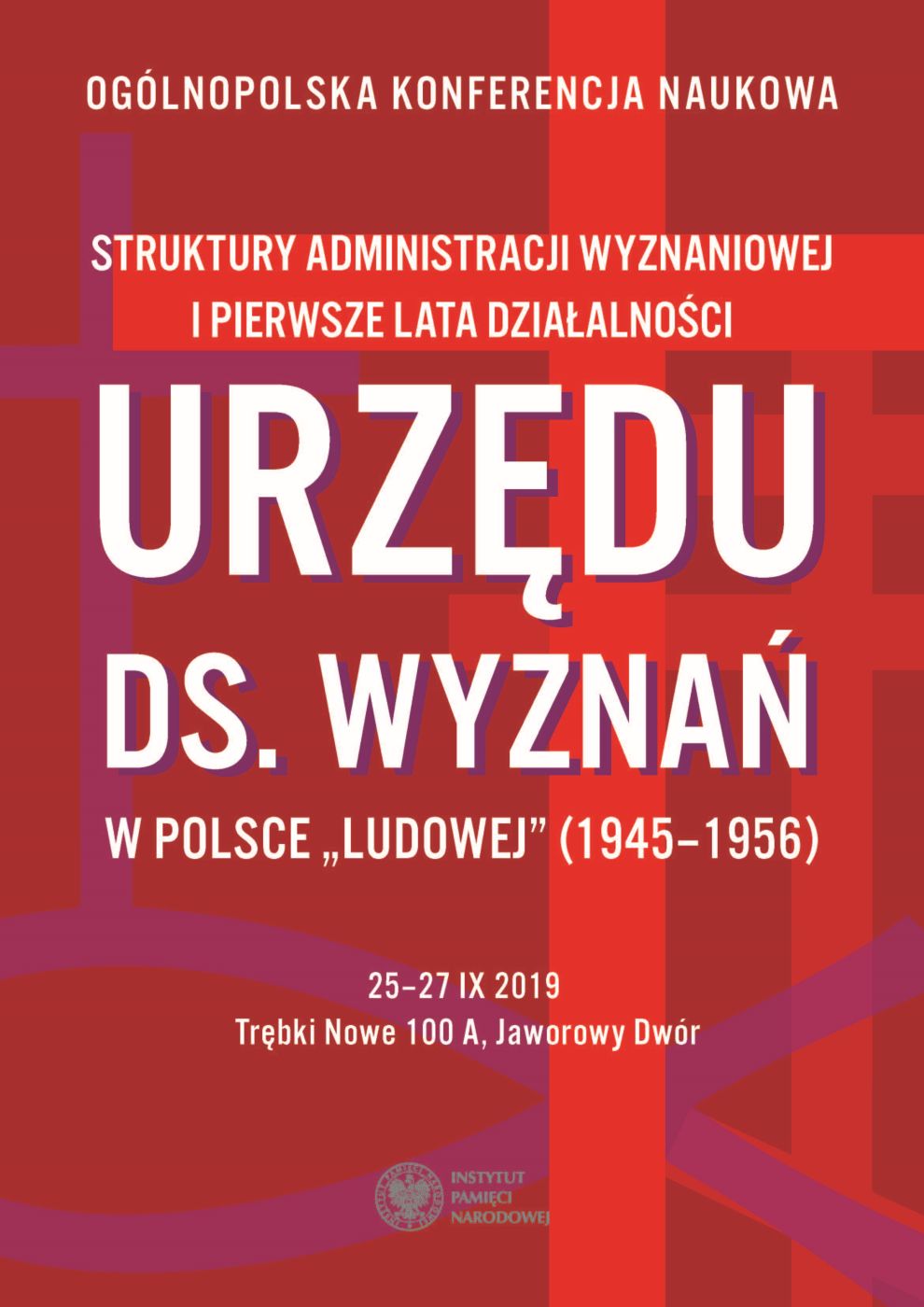 Celem konferencji, realizowanej w ramach Centralnego Projektu Badawczego IPN „Władze komunistyczne wobec Kościołów i związków wyznaniowych w Polsce w latach 1944–1989”, będzie omówienie działalności i sposobu funkcjonowania aparatu wyznaniowego Polski „ludowej” w latach 1945–1956. Konferencja odbędzie się w dniach 25–27 września 2019 w Trębkach Nowych 100 A, Jaworowy Dwór.