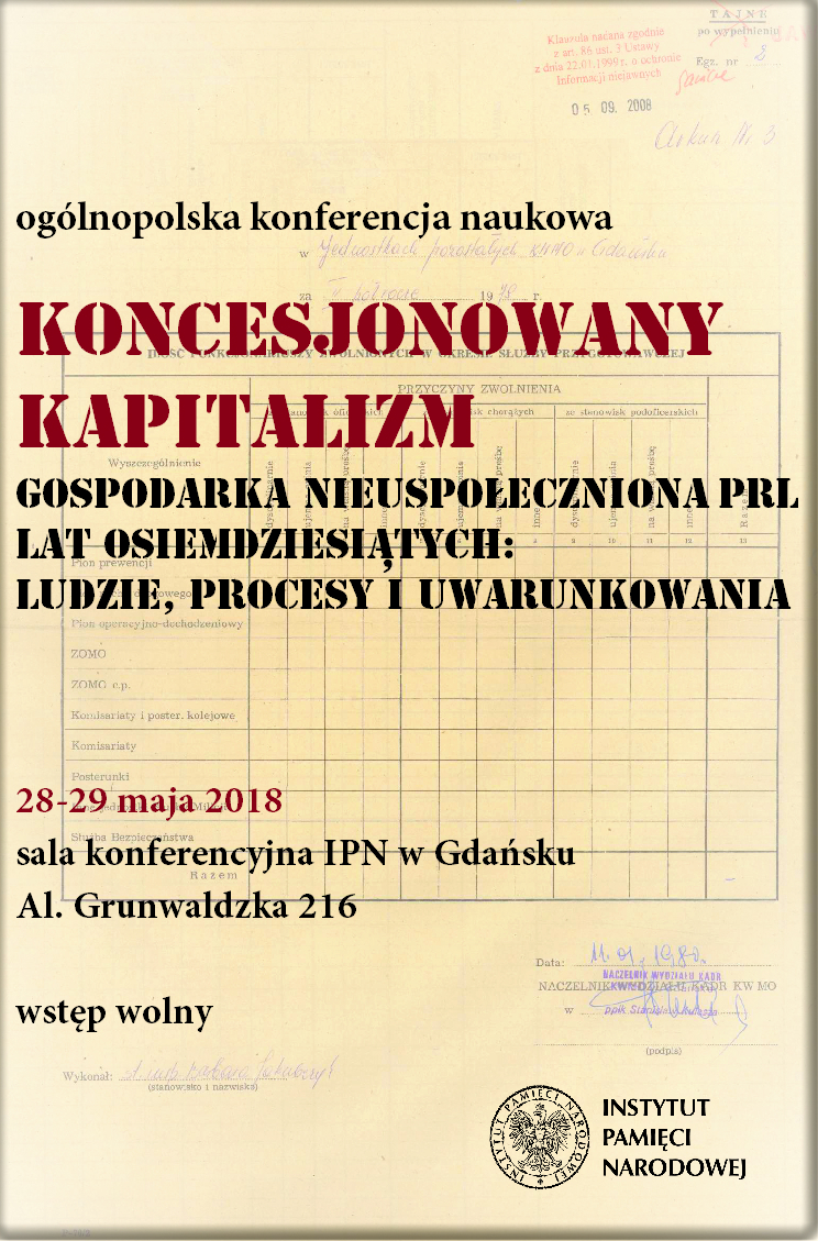 W dniach 28–29 maja br. w Oddziale IPN w Gdańsku odbyła się konferencja naukowa „Koncesjonowany kapitalizm. Gospodarka nieuspołeczniona PRL lat osiemdziesiątych: ludzie, procesy i uwarunkowania”. Uczestniczyło w niej kilkunastu pracowników wyższych uczelni i ośrodków naukowych całego kraju. Odbyło się pięć sesji wykładowych, w trakcie których przedstawione zostały następujące problemy badawcze: