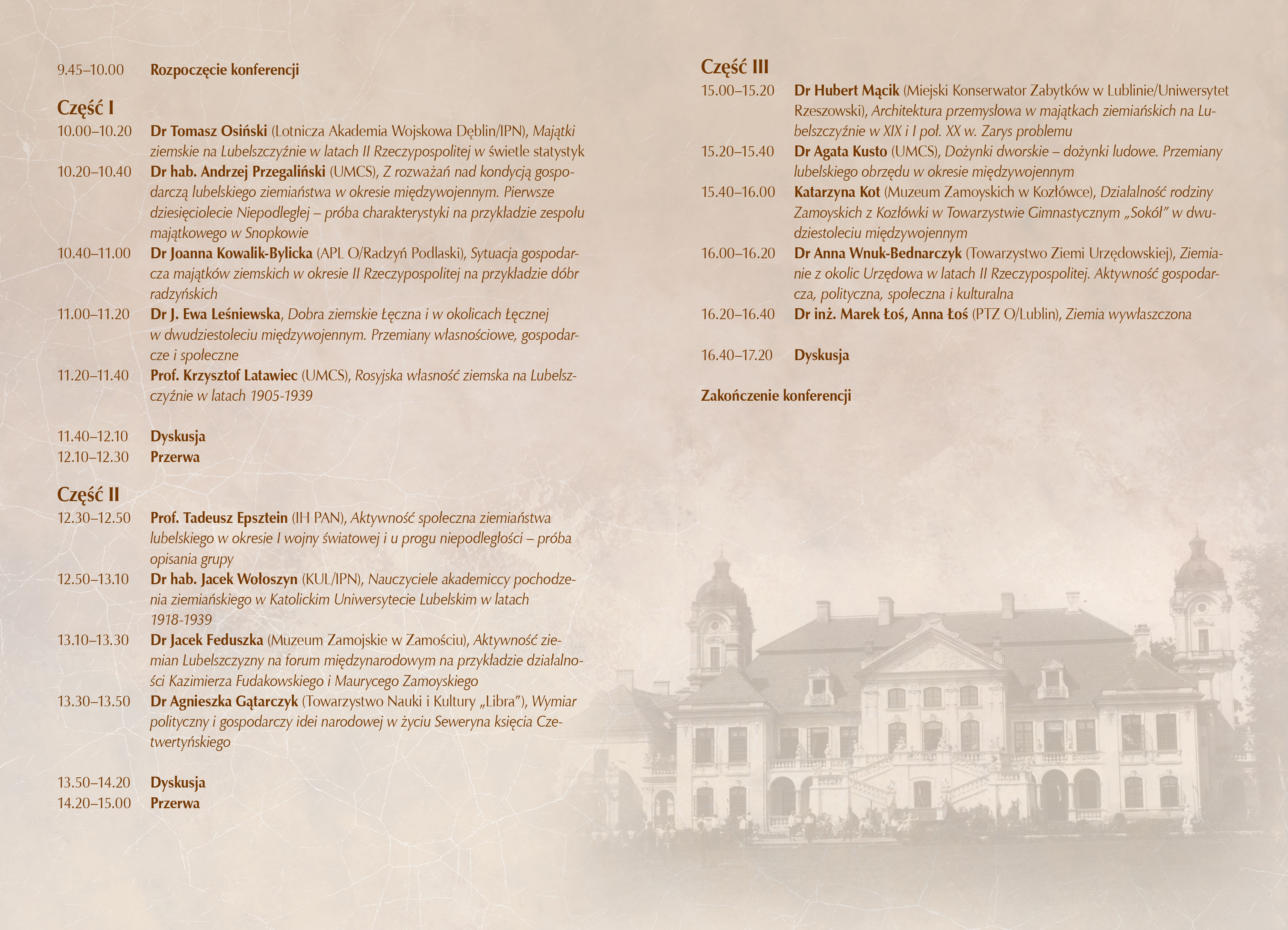 Sfery ziemiańskie, z racji zajmowanej częstokroć lojalistycznej postawy wobec zaborców, okres politycznej świetności w roku 1918 miały już za sobą. Wprowadzone u zarania niepodległości powszechne prawo wyborcze jeszcze bardziej ograniczało wpływy niniejszej warstwy. Jednak ta elitarna grupa, dysponująca wciąż poważnymi atutami: liczącą się bazą finansową, potencjałem intelektualnym i dużym doświadczeniem w działalności politycznej, stanowiła poważny punkt odniesienia w czasach II RP i wymaga bliższego namysłu naukowego. Zagadnienia te były rozważane z perspektywy lokalnej – losów Lubelszczyzny i ziemiaństwa na Lubelszczyźnie. Z pewnością zaplanowane wystąpienia zaciekawiły każdego, kogo pasjonują dzieje II RP.