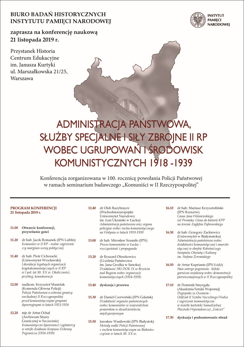 Biuro Badań Historycznych Instytutu Pamięci Narodowej zaprasza na konferencję naukową „Administracja państwowa, służby specjalne i siły zbrojne II RP wobec ugrupowań i środowisk komunistycznych 1918–1939”, która odbędzie się 21 listopada 2019 r. w Centrum Edukacyjnym im. Janusza Kurtyki, przy ul. Marszałkowskiej 21/25 w Warszawie.