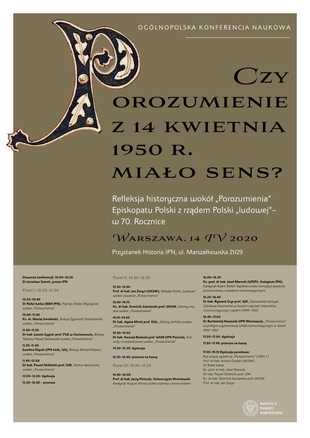 Biuro Badań Historycznych IPN w Warszawie zaprasza na ogólnopolską konferencję naukoąj „Czy porozumienie z 14 kwietnia 1950 r. miało sens? Refleksja historyczna wokół »Porozumienia« Episkopatu Polski z rządem Polski »ludowej«. W 70. rocznicę”, która odbędzie się 14 kwietnia 2020 r. w Warszawie.