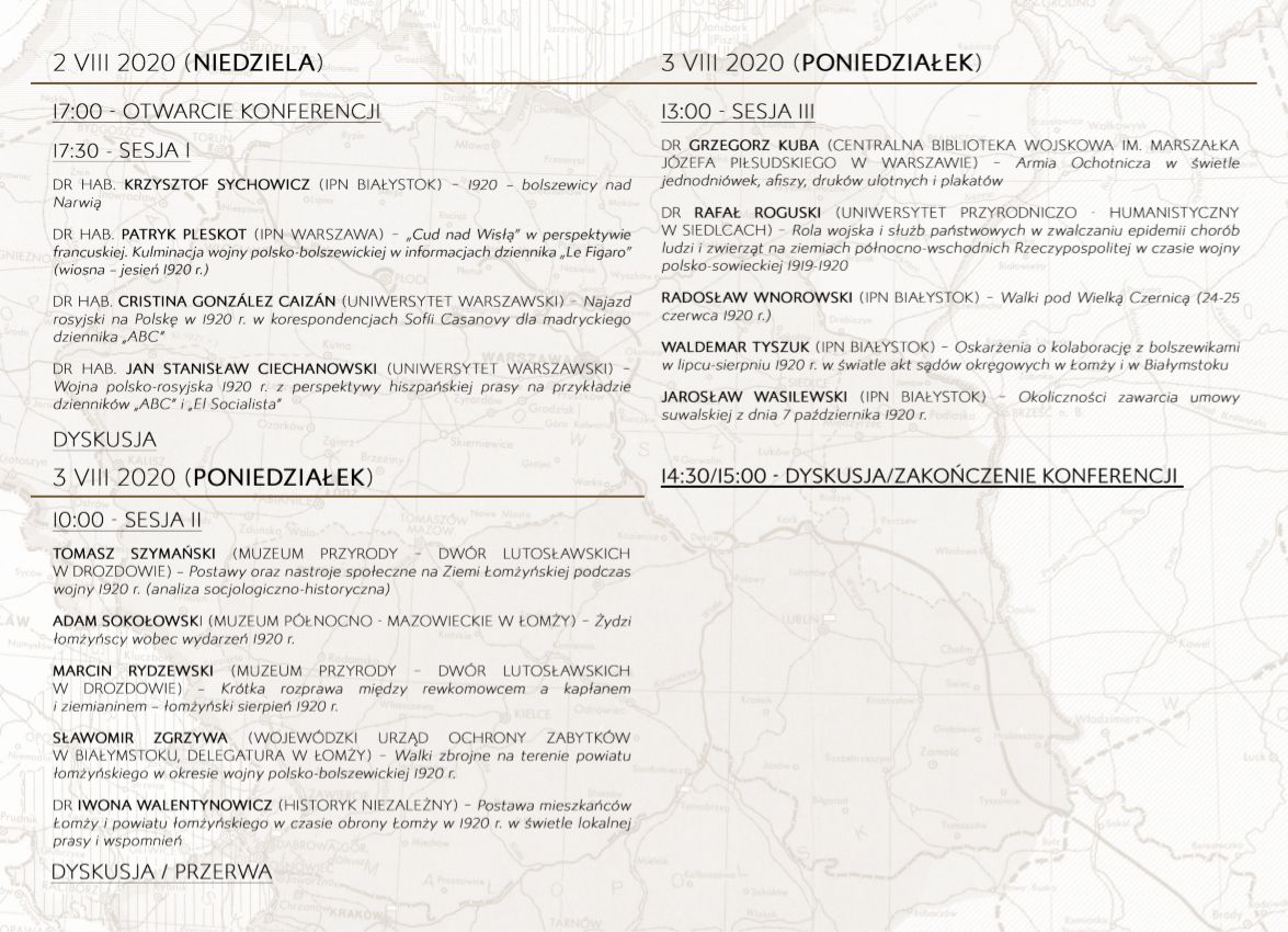 Kontynuując obchody stulecia odzyskania przez Polskę niepodległości, w które wpisywała się ubiegłoroczna konferencja IPN „Ku niepodległości – kierunek północno-wschodni – 1918–1923”, oddział IPN w Białymstoku oraz Starostwo Powiatowe w Łomży zorganizowały ogólnopolską konferencję naukową poświęconą wojnie Polski z Rosją sowiecką. Tym razem pochylono się nad wydarzeniami, które rozegrały się na ziemiach północno-wschodnich dawnej Rzeczypospolitej od wiosny 1920 r. (ofensywa bolszewicka) do jesieni (zawieszenie broni), a przede wszystkim nad ludźmi, którzy sto lat temu odegrali szczególną rolę w obronie Ojczyzny i zniweczyli bolszewickie plany „eksportu rewolucji” na Zachód. Organizatorom zależało na ukazaniu nie tylko zbrojnych i politycznych działań w zmaganiach o Niepodległą i kształt jej wschodniej granicy, ale także aspektów społecznych i gospodarczych w lokalnej perspektywie, które wiązały się z trwającym konfliktem. Kierunek północno-wschodni, w kontekście terytorialnych ram konferencji, stanowiły zarówno województwo białostockie II Rzeczypospolitej, powołane do życia w 1919 r., jak i ziemie podległe w latach 1919–1920 Zarządowi Cywilnemu Ziem Wschodnich.