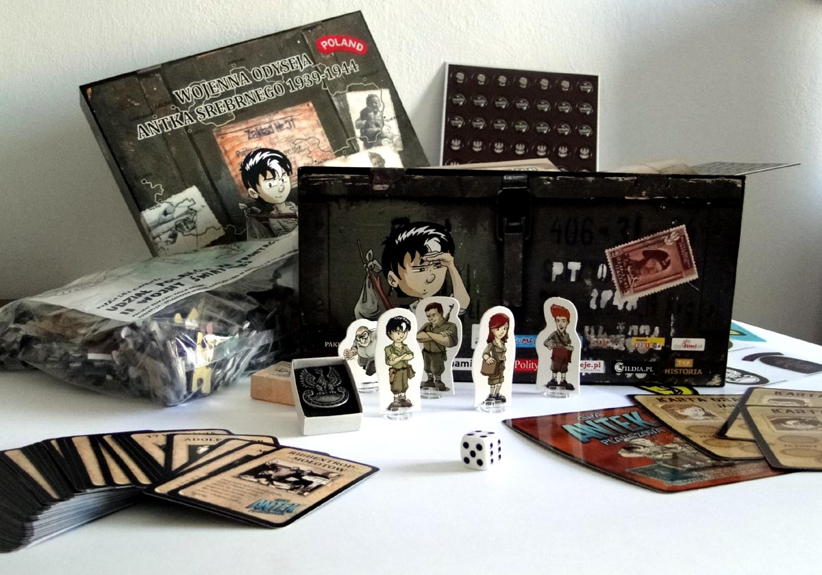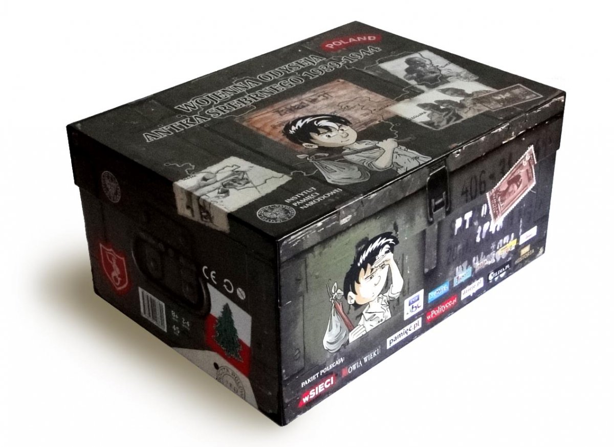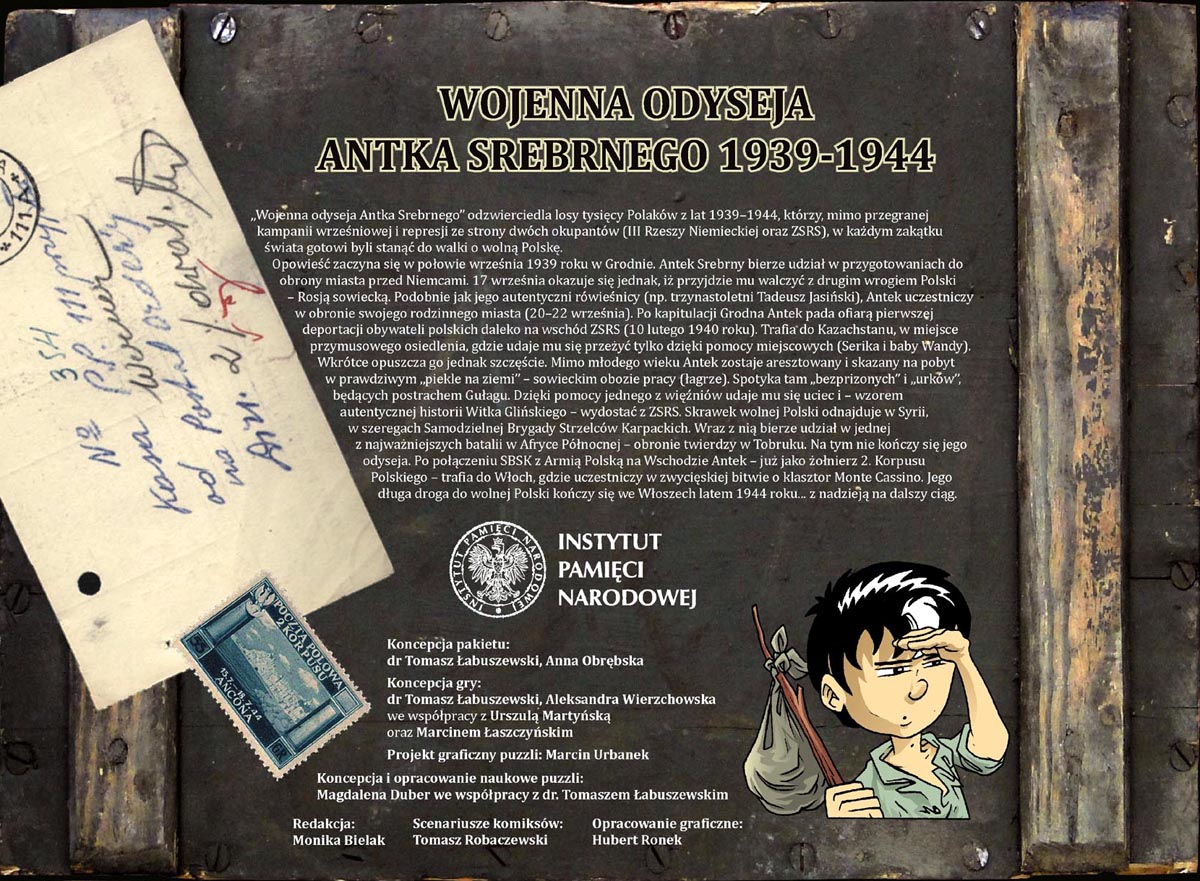 Wojenna odyseja Antka Srebrnego 1939–1944, pakiet (cztery komiksy, gra planszowa, dwustronne puzzle, zestaw naklejek na ubrania), Warszawa 2015