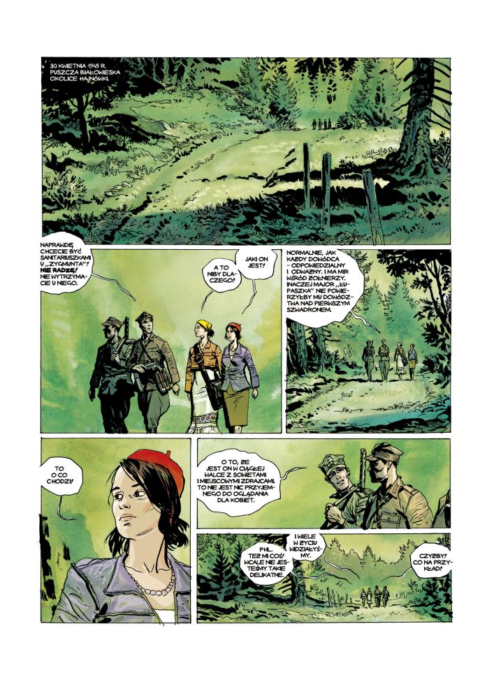 Kwiecień 1945 r. Młoda dziewczyna – „Krystyna” (Alicja Trojanowska) wstępuje do oddziału Zygmunta Błażejewicza „Zygmunta”, wchodzącego w skład 5. Brygady Wileńskiej majora Zygmunta Szendzielarza „Łupaszki”. Ponieważ Białostocczyzna, gdzie działa 5. Brygada, jest coraz silniej penetrowana przez wojska sowieckie, major „Łupaszka” decyduje się wysłać oddział „Zygmunta” na lewy brzeg Bugu z zadaniem rozpoznania nowych terenów, na których możliwe byłoby prowadzenie skutecznej walki. Co spotka „Zygmunta” na drugim brzegu? Czy „Krystyna” zdobędzie jego zaufanie? Co robił w tych czasach Paweł Jasienica? Jak potoczą się losy bitwy w Modusach Pokrzywnych? To wszystko w pierwszym zeszycie komiksowego cyklu zatytułowanego „Wilcze tropy”.