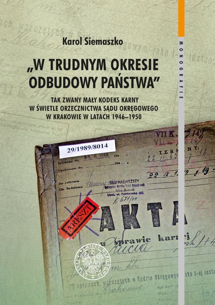 Karol Siemaszko, „W trudnym okresie odbudowy państwa”. Tak zwany mały kodeks karny w świetle orzecznictwa Sądu Okręgowego w Krakowie w latach 1946–1950, Warszawa 2015, 351 s. (seria „Monografie”, t. 107)
