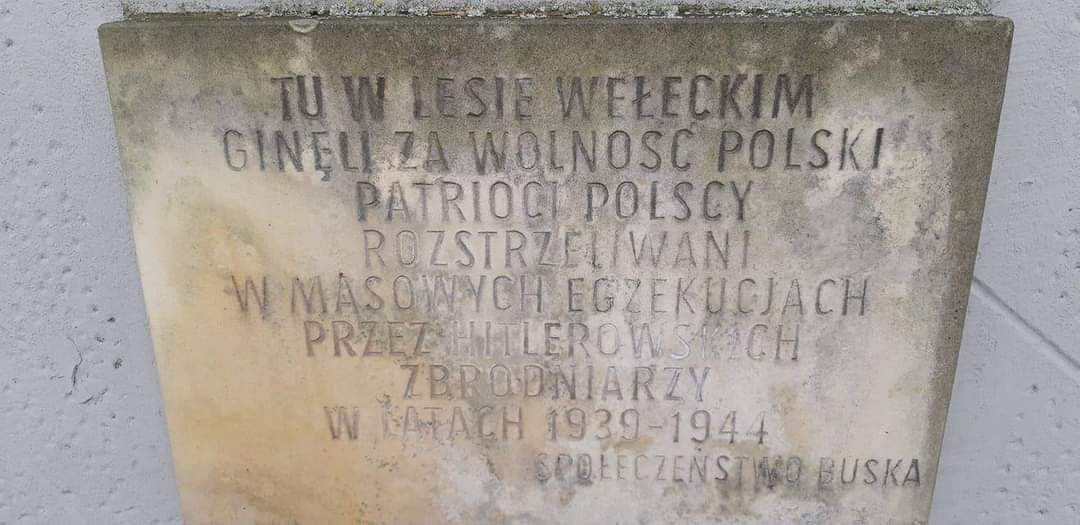 Według moich ustaleń egzekucje miały tam miejsce w latach 1941–1945, niemniej na skraju lasu, przy drodze Busko-Zdrój–Pińczów znajduje się pomnik zaprojektowany w 1964 r. przez buskiego rzeźbiarza Leszka Kurzeję. Umieszczona na nim inskrypcja głosi: „Tu, w Lesie Wełeckim, ginęli za wolność Polski patrioci polscy rozstrzeliwani w masowych egzekucjach przez hitlerowskich zbrodniarzy w latach 1939–1944. Społeczność Buska”. Moje ustalenia wskazują, że ostatnia egzekucja miała miejsce 12 stycznia 1945 r. – rozstrzelano wówczas 20 osób.