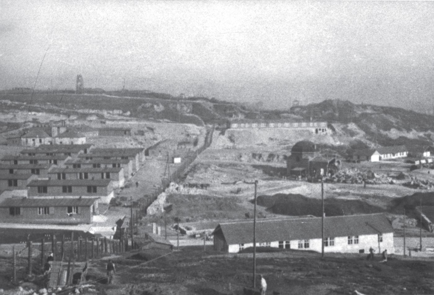 Panorama z wieży przeciwlotniczej. W dole Bergstrasse i ruiny domu przedpogrzebowego, wyżej SS-Lazaret, na prawo komendantura. Z lewej baraki mieszkalne dla Polaków, w środku linia ogrodzenia wewnętrznego oddzielająca część więźniarską od części niemieckiej (Fot. z Archiwum Instytutu Pamięci Narodowej)